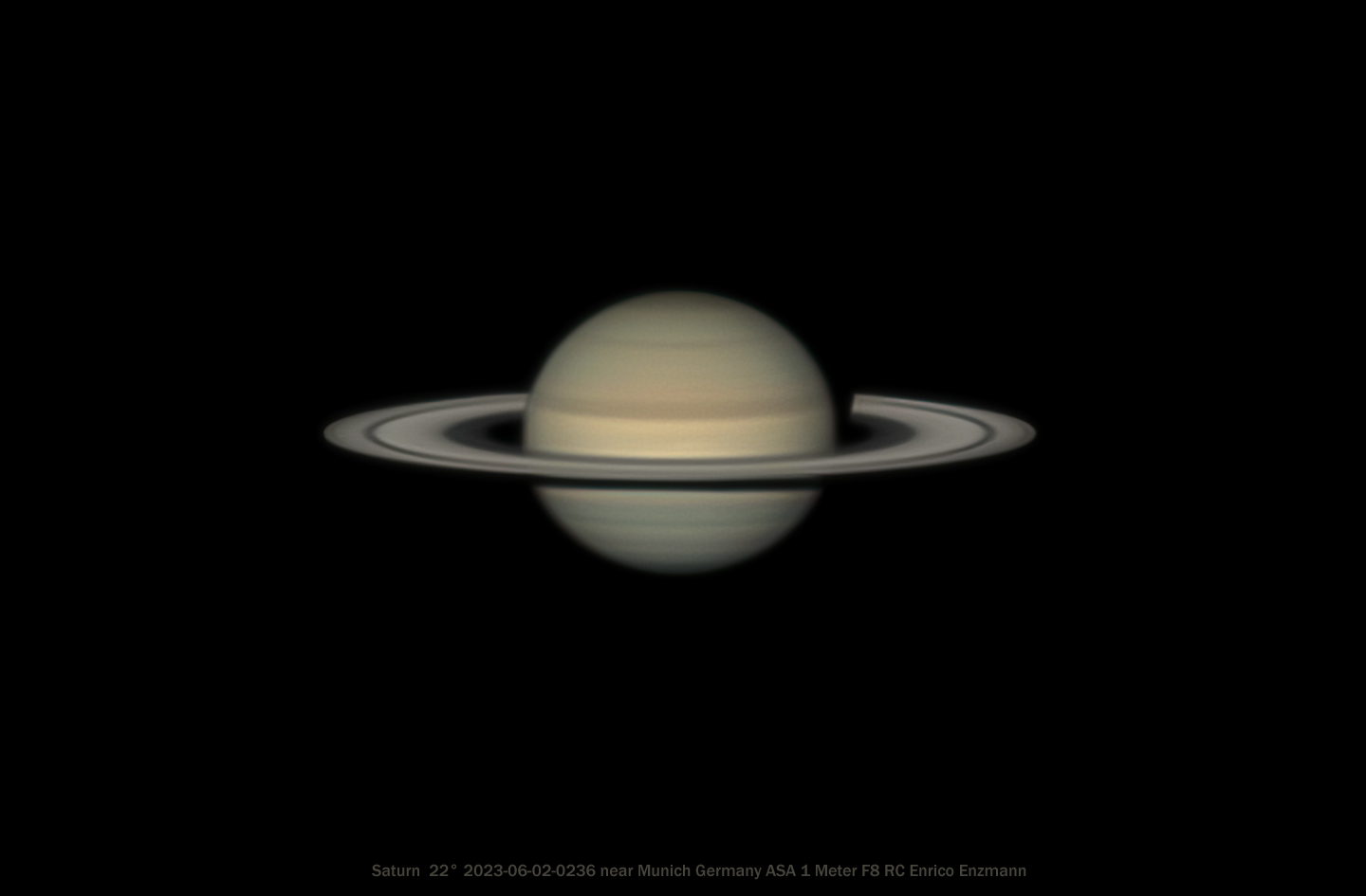 Das gute Seeing hält an. Heute Früh am 2. Juni 2023 konnte ich Saturn bei guten Seeing Bedingungen aufnehmen. Im Mittel war Saturn zum Zeitpunkt der Aufnahme 22 Grad über Horizont. Trotzdem ist ansatzweise die Encke-Teilung des Ringsystems in beiden Ecken sichtbar. Diese darzustellen wird immer schwieriger da sich die Sicht auf die Ringe immer weiter in den nächsten Jahren verschlechtert wird, bis nur noch ein Stich zu sehen sein wird. Dies wird ca. Mitte Ende 2024 der Fall sein.