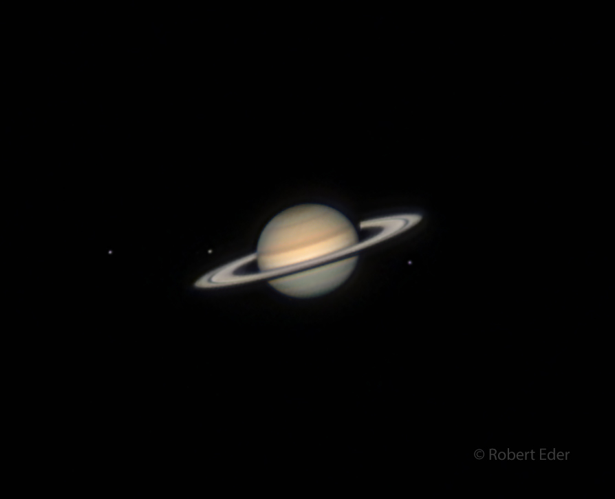 Meine erste Aufnahme vom Saturn dieses Jahr. Um 3:15 Uhr schon in der Dämmerung auf 25° Höhe, bei ganz gutem Seeing. Mir gefällt die aktuelle Ringneigung sehr gut. Man sieht unten schön den Schatten der Ringe am Planeten, das wirkt sehr plastisch. Die Monde Rhea, Tethys und Dione (von Links nach Rechts) sind auch noch drauf. SW Newton 200/1000, ASI120MC-S, Omegon ADC, APM 2,7x Barlow, IR-Pass 680nm