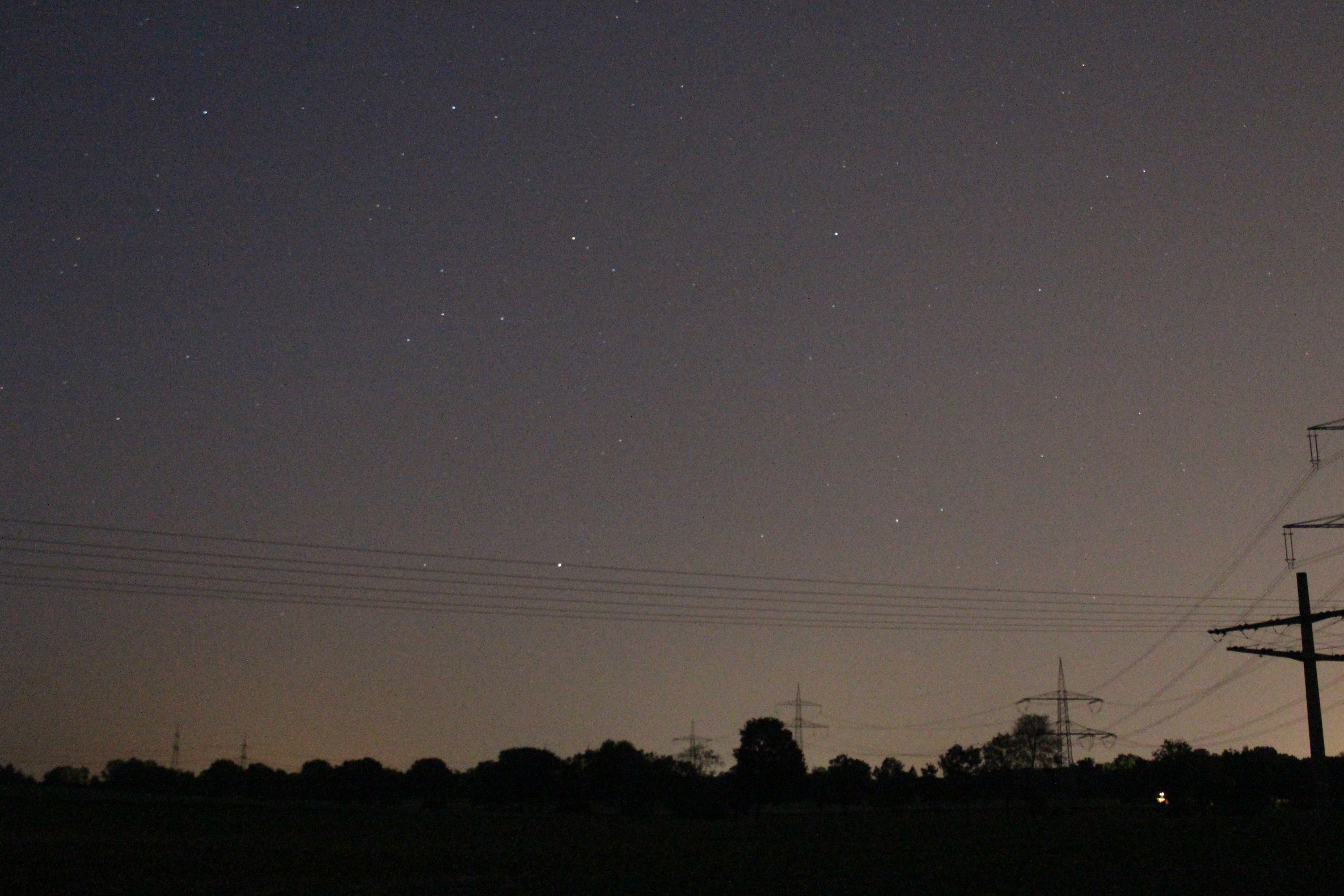 Saturn am Morgenhimmel, aufgenommen nördlich von Ludwigsburg mit einigen zum Umspannwerk Hoheneck führenden Hochspannungsleitungen im Vordergrund.