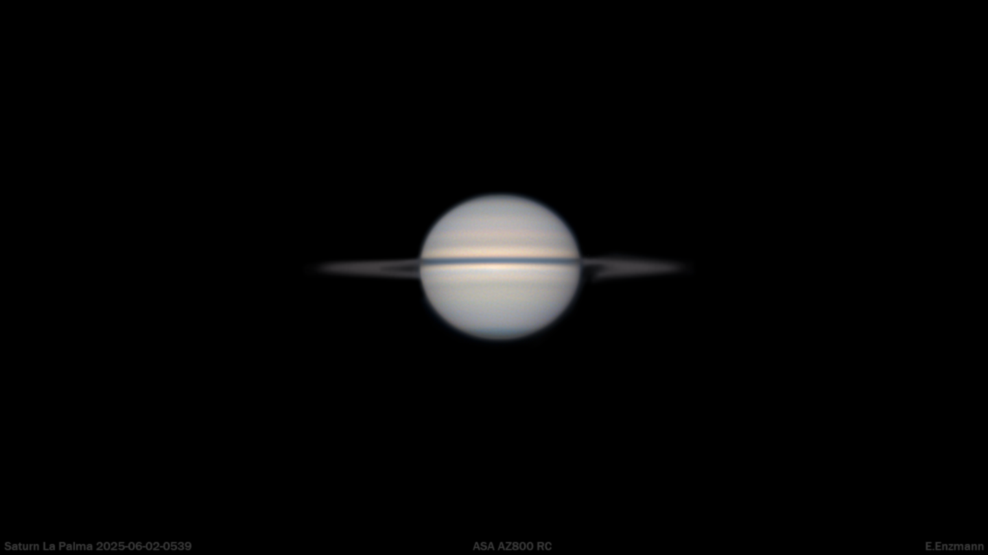 Ein sehr frühes Saturn-Bild aus La Palma am 2. Juni 2025 aufgenommen mit voller Teleskopöffnung. Das Bild wurde rund um den Sonnenaufgang gemacht mit einer Belichtungszeit von zirka 30 Minuten.
