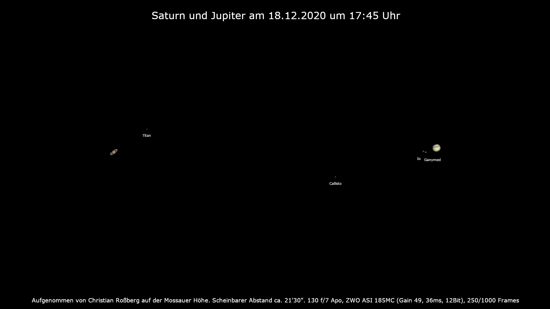 Saturn und Jupiter mit 21'30" Abstand am 18.12.20 um 17:45 Uhr. Aufgenommen auf der Mossauer Höhe. Die wohl verrückteste Beobachtungsnacht des Jahres: Als ich mit dem vollgepackten Auto Richtung Modautal gefahren bin, was alles neblig. Also einen Vereinskamerad im Mossautal angerufen und siehe da: Perfekte Sicht ca. 45 Minuten südlich von Darmstadt. UM 17:00 Uhr alles aufgebaut und ein paar Schöne Aufnahmen gemacht. Dann noch etwas "Deep Sky" beobachtet. Es war feucht aber eine tolle Sicht. Gerne hätte ich noch weiter beobachtet, aber um 20:00 Uhr war schnelles Einpacken angesagt. Denn im Odenwaldkreis galt ab 21:00 Uhr eine Ausgangssperre.