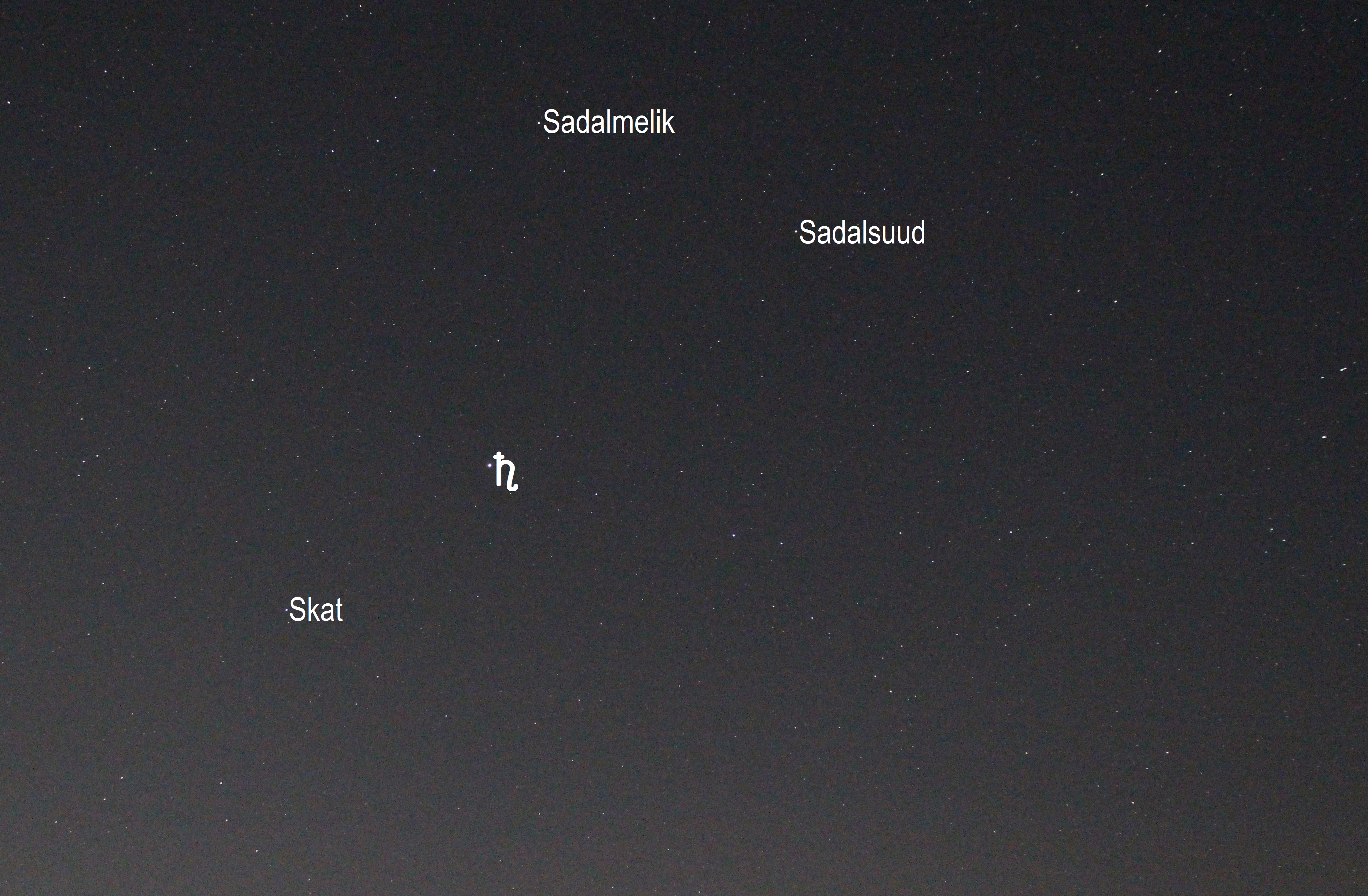 Leserbilder Astronomie: Saturn im Sternbild Wassermann (Objekte beschriftet)