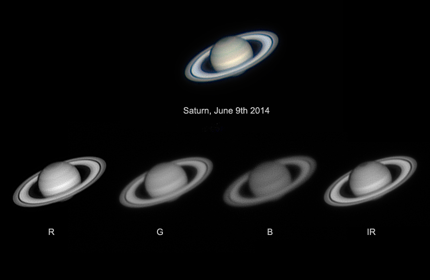 Angesichts der sehr tiefen Position für uns Mitteleuropäer hatte ich an diesem Abend gutes Seeing. Hier alle Kanäle, das fertige Bild ist ein IR/R-RGB. Die Luminanz ist eine Kombination aus R und IR.