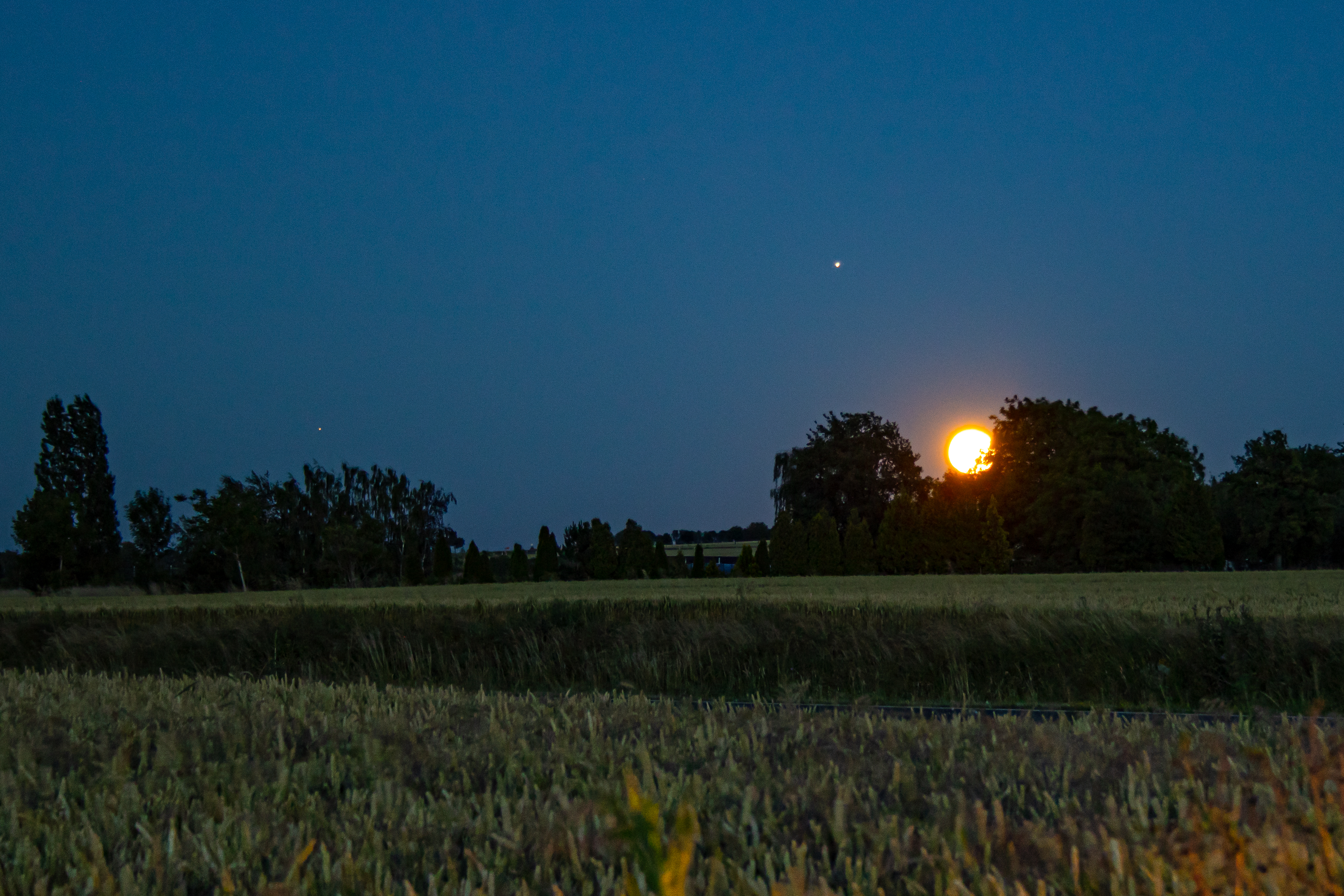 Ein weiteres Treffen der beiden Gasriesen mit dem Mond. Ein etwas improvisierter Schnappschuss, da ein riesiges Display der Leuchtenden Nachtwolken die Planung durcheinander brachte. Bei dieser Aufnahme waren Saturn und der Vollmond nicht einmal zwei Grad über dem Horizont