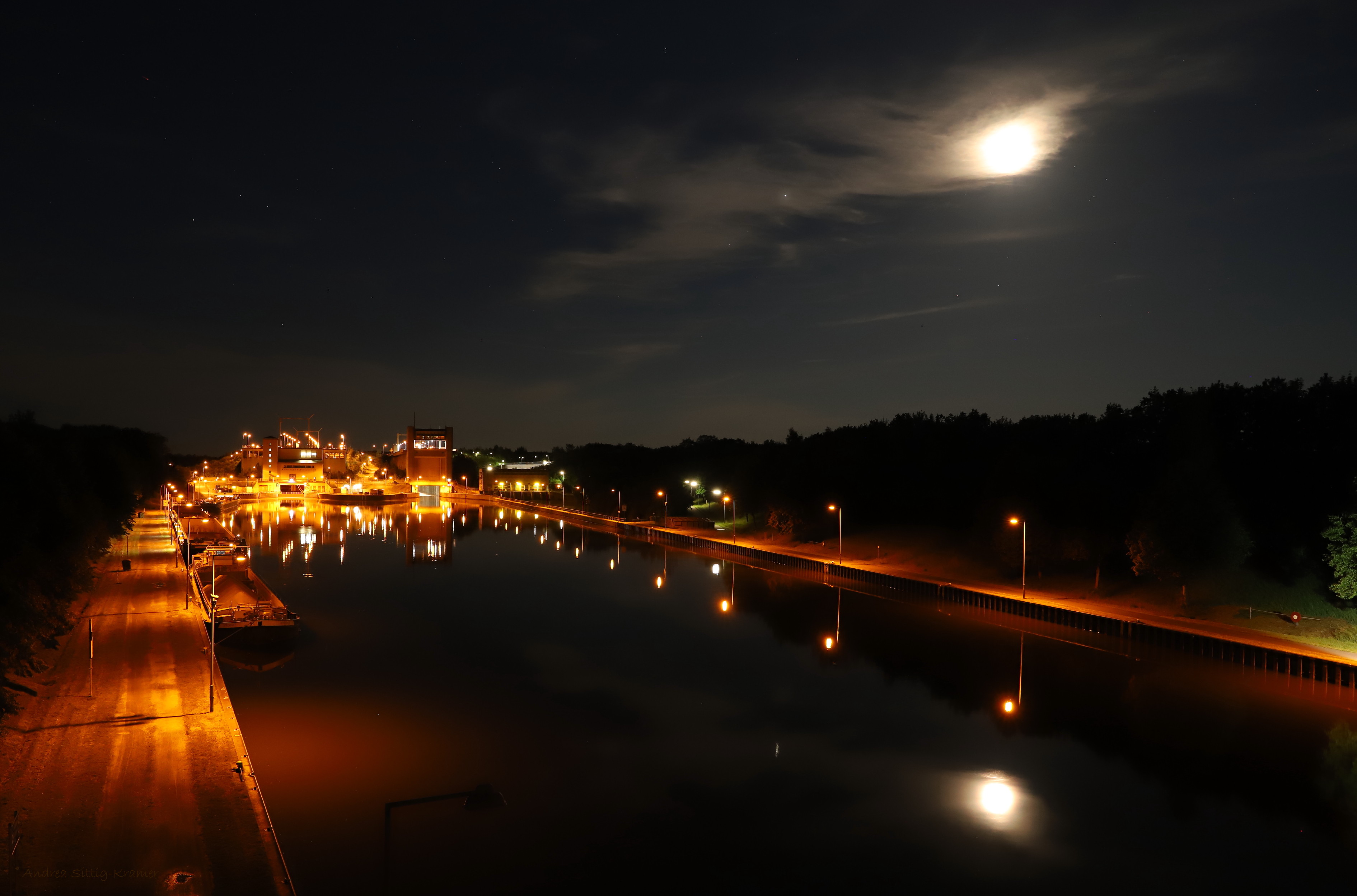 In der Nacht vom 15./16. Juni 2019 - einen Tag vor Vollmond - stand unser Trabant im Sternbild Skorpion (Sco) über Antares, dem Alphastern Sco, im gleichen Blickfeld mit Jupiter und Saturn. Diese hübsche Konstellation habe ich an der Schleuse Uelzen-Esterholz fotografiert. Tagsüber herrscht dort reger Schiffsverkehr. Seit dem Erweiterungsbau 2006 können hier Schiffsschubverbände bis 185 m Länge auf eine Höhe von 23 Meter herauf- bzw. heruntergeschleust werden. Nachts ist es am Elbe-Seiten-Kanal relativ ruhig – die Beleuchtung der Anlage ist aber weithin sichtbar.