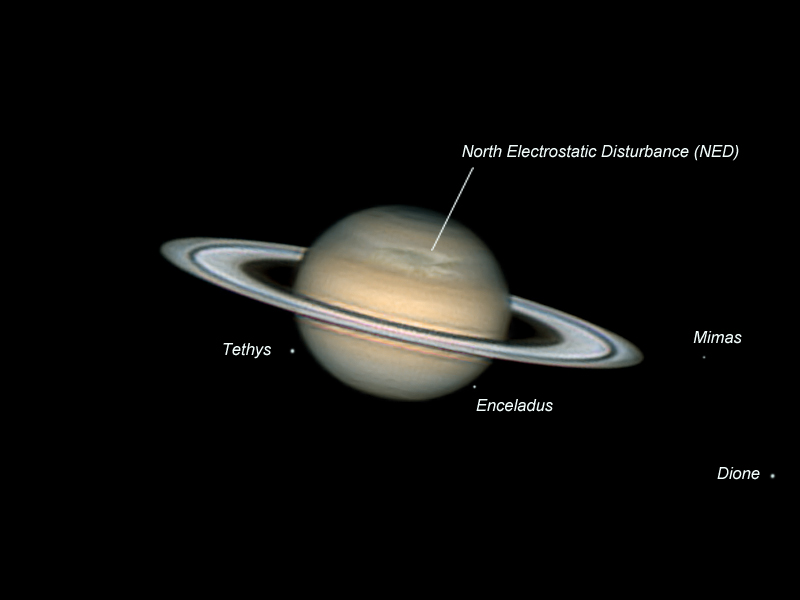 Saturn am 12.4.2011 mit vier Satelliten. Klar zu sehen ist die NED (North Elecrostatic Disturbance). Die Planetaufnahme ist ein Stack von 1600 Einzelbilder bearbeitet mit Registax 5. Eine zweite 10-s-Aufnahme für die Satelliten wurde mit CCD-Kamera gemacht. Überlappung von beiden Bildern in Photoshop.