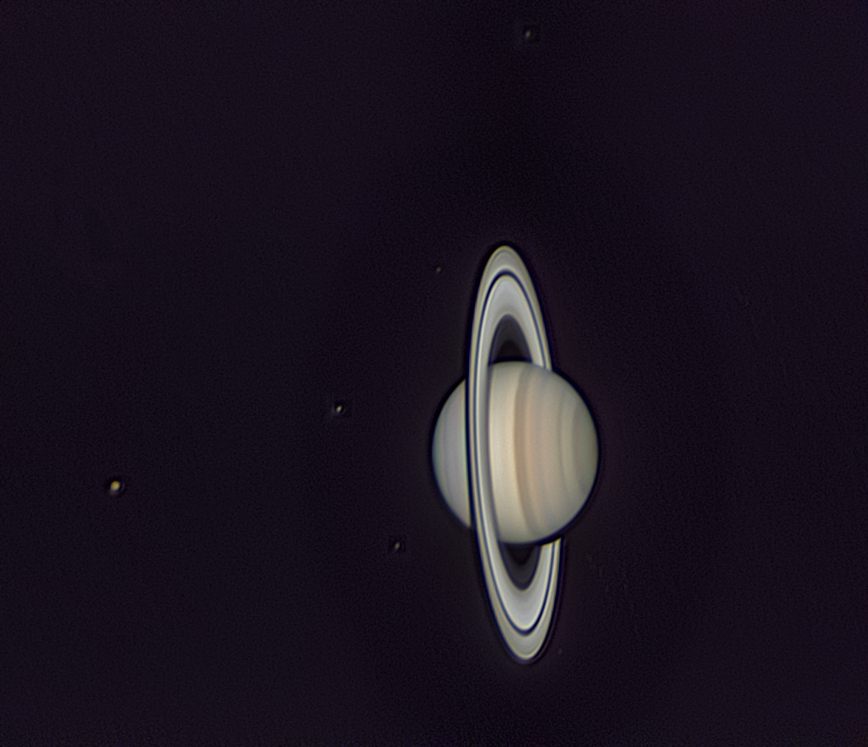 Saturn mit sechs Monden: Von oben nach unten: Tethys, Enceladus, Rhea, Titan (ganz links), Dione, Mimas (ganz schwach unten rechts neben dem Ende des Rings). Diese Aufnahme gelang mir heute Morgen von Borneo aus.