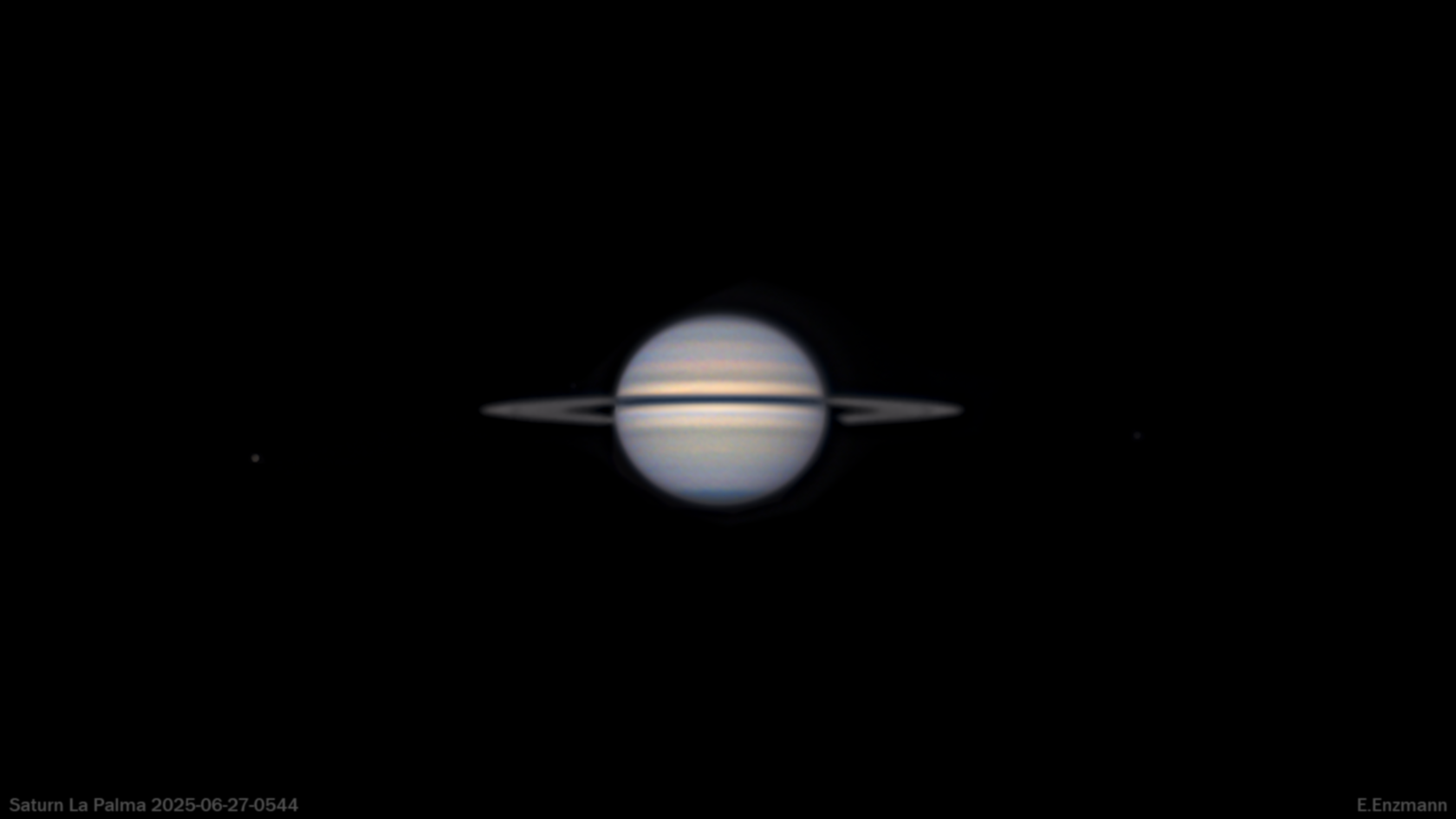 Saturn vom 27. Juni 2025 aus La Palma. Es sieht so aus, als wären einige dezente Oberflächendetails unterhalb vom Ring sichtbar. Man kann auch links den Mond Rhea und, wenn man genau hinsieht, rechts den sehr dunklen Mond Tethys sehen.