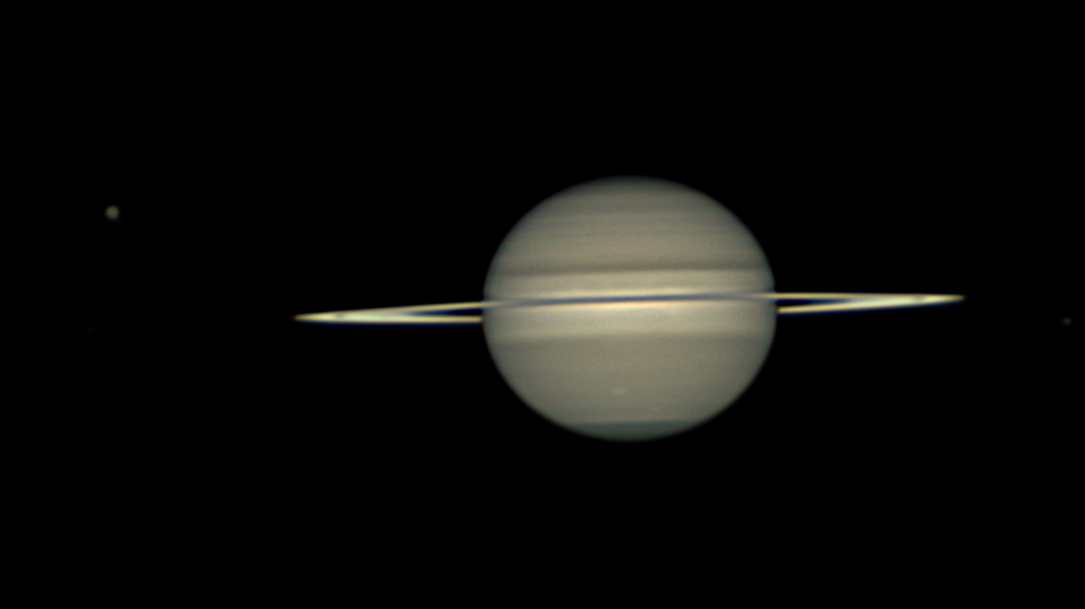 Saturn, aufgenommen am 19. September 2025 mit zwei Stürmen im Süden sowie den Monden Titan am linken und Dione am rechten Bildrand