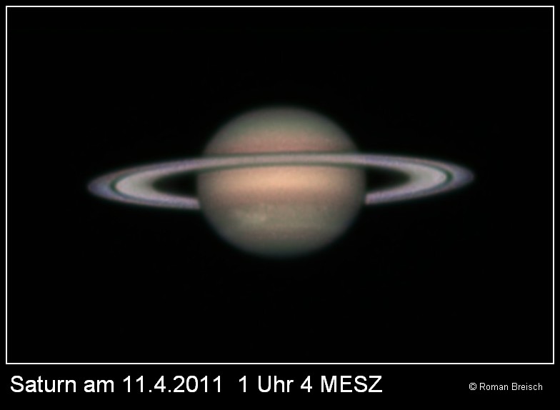 Die Nacht vom 10. auf 11. April 2011 ließ endlich mal wieder hochauflösende Bilder von Saturn zu. Am besten war das Seeing kurz nach ein Uhr, als sich die von Nordwesten anrückende Front hier bei uns im Süden bereits ankündigte.