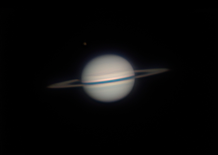 Natürlich habe auch ich mich gestern am frühen Abend in die Sternwarte gesetzt, um die bevorstehende Abdunkelung des Mondes Titan durch seinen Planeten Saturn zu beobachten. Gesehen habe ich die abnehmende Helligkeit des Mondes im Livebild, aber das fotografisch festzuhalten, war nicht möglich - zu unruhig die Atmosphäre, zu tief der Stand über dem Horizont, bzw. ist die Albedo vom Titan sehr gering.