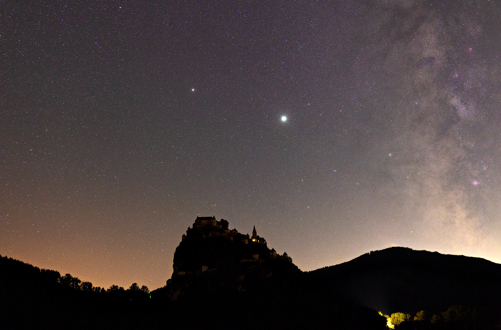Blick von meiner Terrasse zur Burg Hochosterwitz mit den beiden Planeten Jupiter und Saturn sowie der Milchstraße.