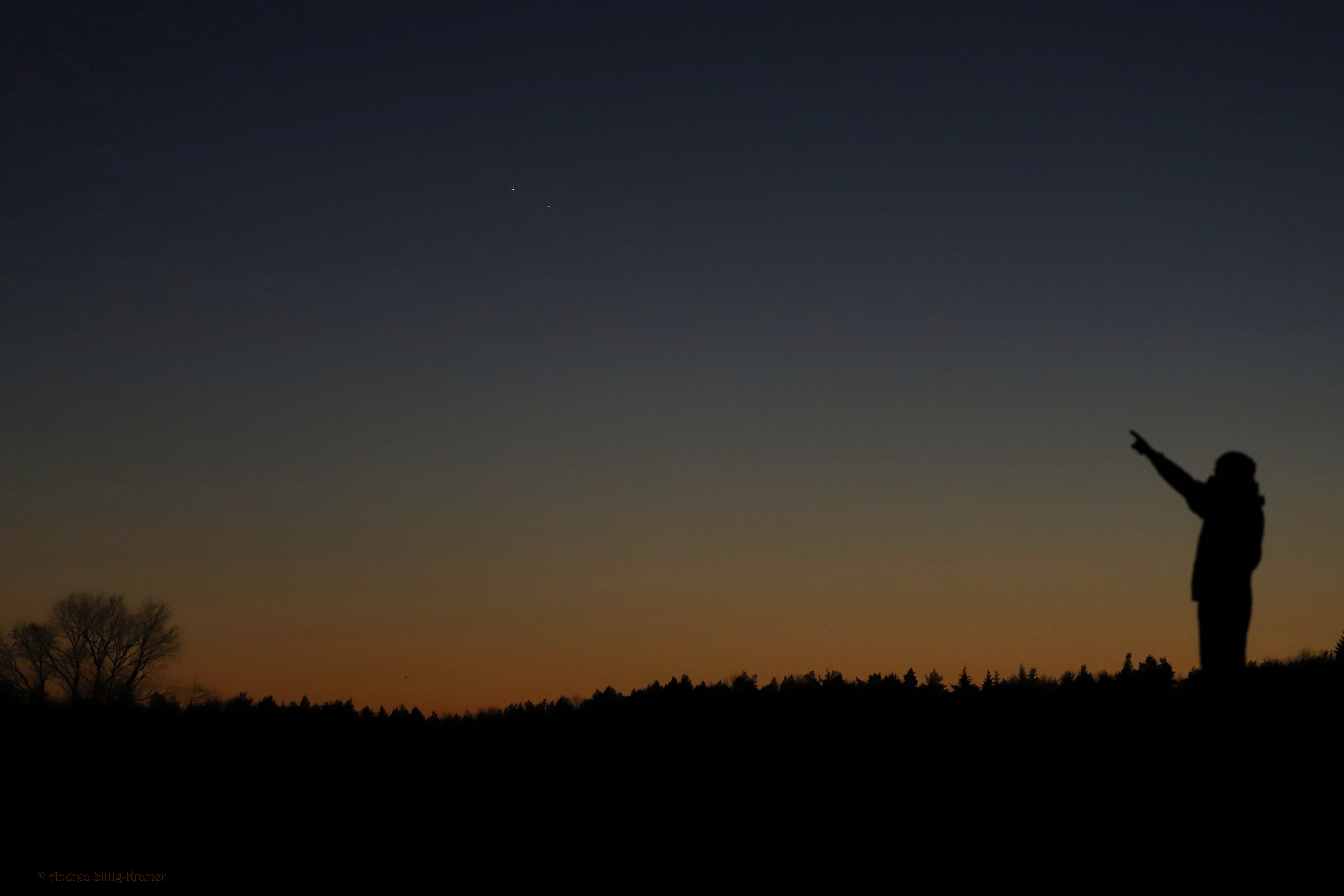 Die Großen Konjunktion konnte der junge Mann auf meinem Foto am Abend des ersten Weihnachtstages 2020 in der Nähe von Uelzen bestaunen (Jupiter links im Bild oberhalb vom Saturn).