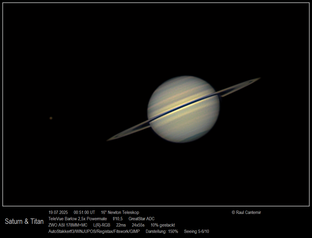 Diese Aufnahme zeigt den Ringplaneten Saturn zusammen mit seinem Mond Titan. Das Bild wurde mit einem 16-Zoll-Newton-Teleskop in leichter Carbon-Gitterrohr-Bauweise aufgenommen. Trotz der großen Entfernung ist der Mond als feiner Lichtpunkt neben der Planetenscheibe klar zu erkennen.