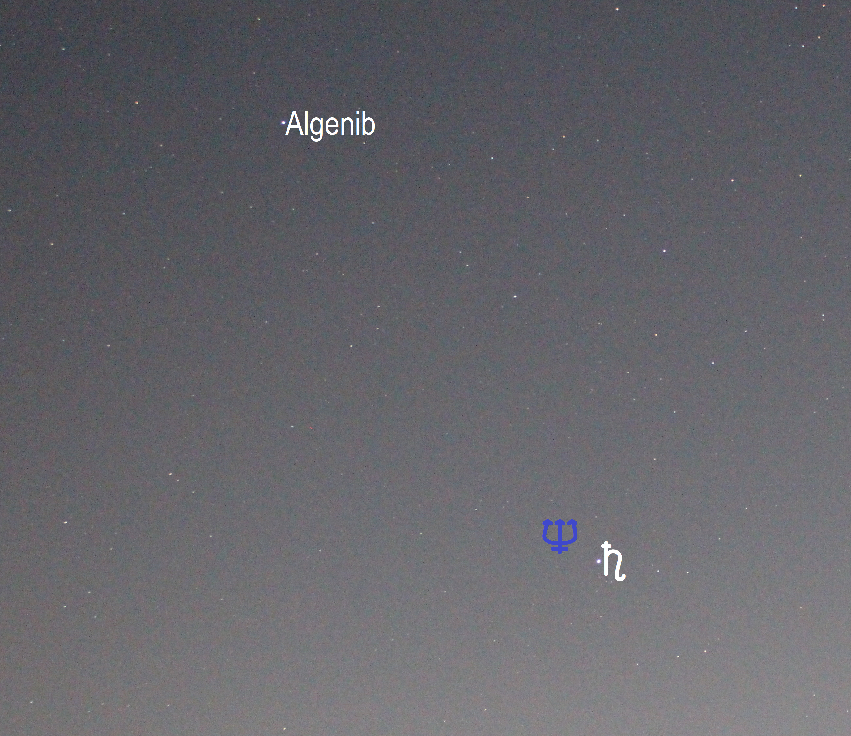 Leserbilder Astronomie: Saturn und Neptun (kurze Brennweite, Objekte beschriftet)