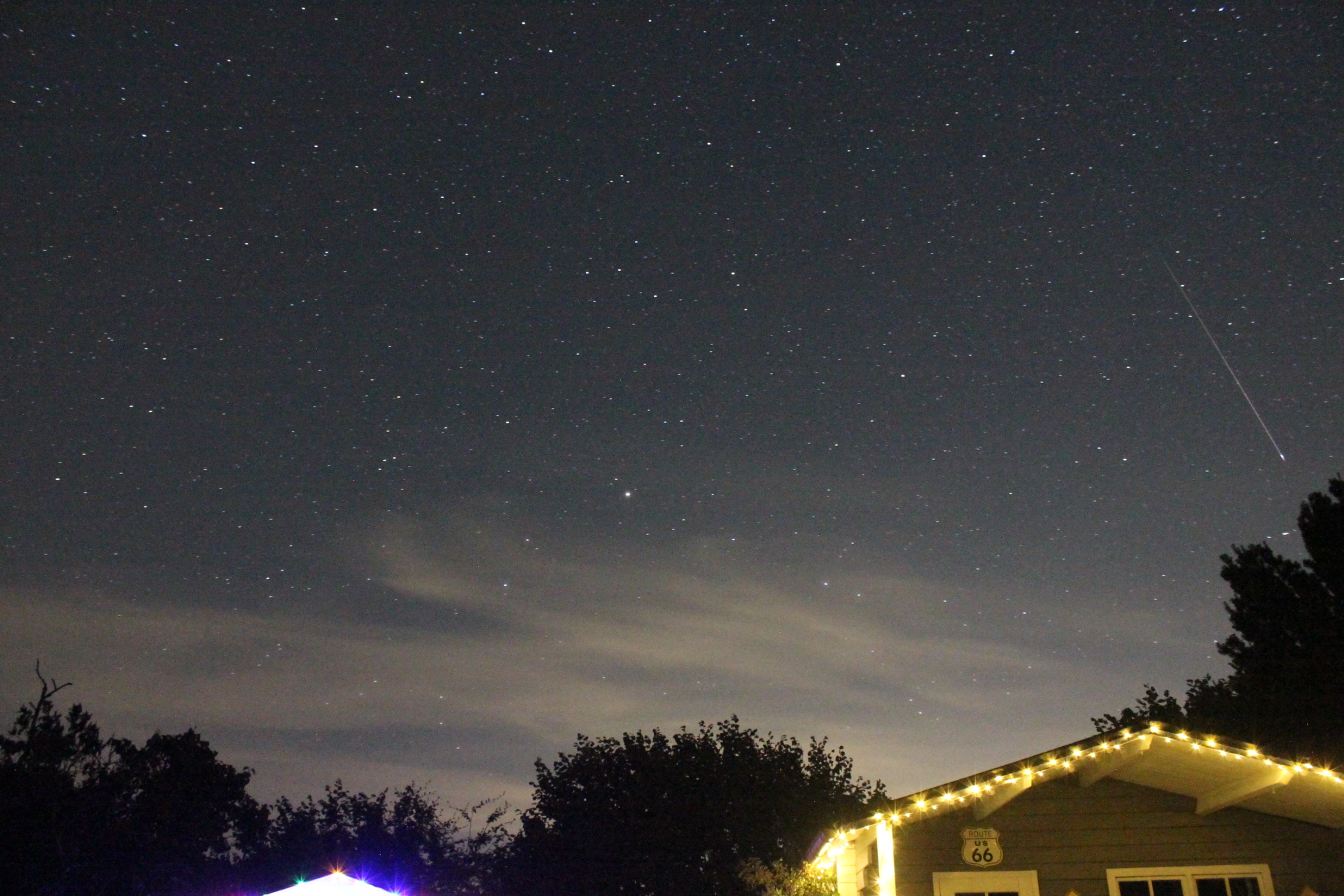 In der Nacht vom 12. auf den 13. August war die höchste Aktivität der Perseiden zu erwarten. Tatsächlich war der Himmel nach Mitternacht soweit aufgeklart, dass es sich lohnen könnte, mit der Kamera auf die Pirsch zu gehen. In der Mitte ist der Wassermann mit Saturn, östlich beginnen die Fische und westlich der Steinbock. Urplötzlich tauchte eine Sternschnuppe auf, die am Ende aufblitzte. Die Wolken wurden vom Stadtlicht der schleswig-holsteinischen Stadt Neumünster angestrahlt.