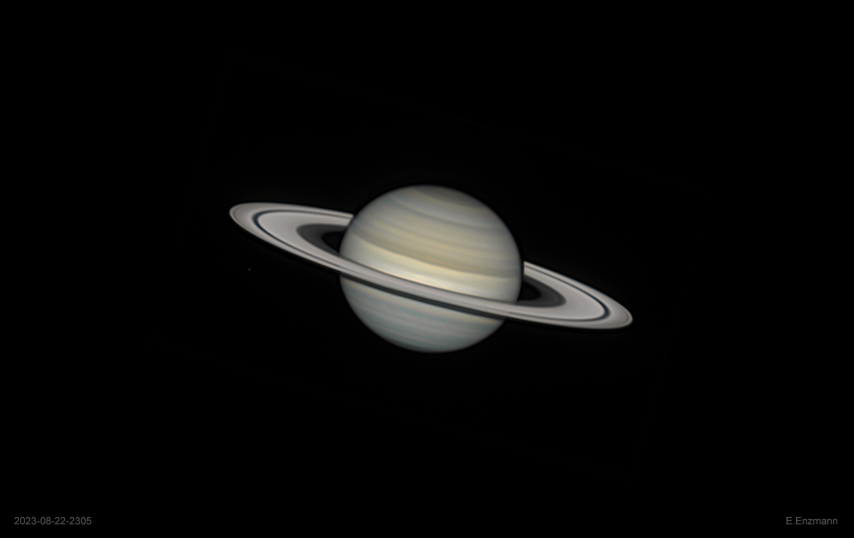 Am 22. August 2023 waren die Bedingungen einige Male recht gut, siehe auch die Jupiterbilder die an diesem Tag entstanden sind und hier veröffentlicht wurden. Vorher hatte ich bei Saturn schon mal eine Phase von gutem Seeing. Wenn man gut mit einem großen Monitor das Bild bei ausreichend Dunkelheit betrachtet, kann man unter Umständen den Mond Enceladus links leicht unterhalb des Ringes erkennen.