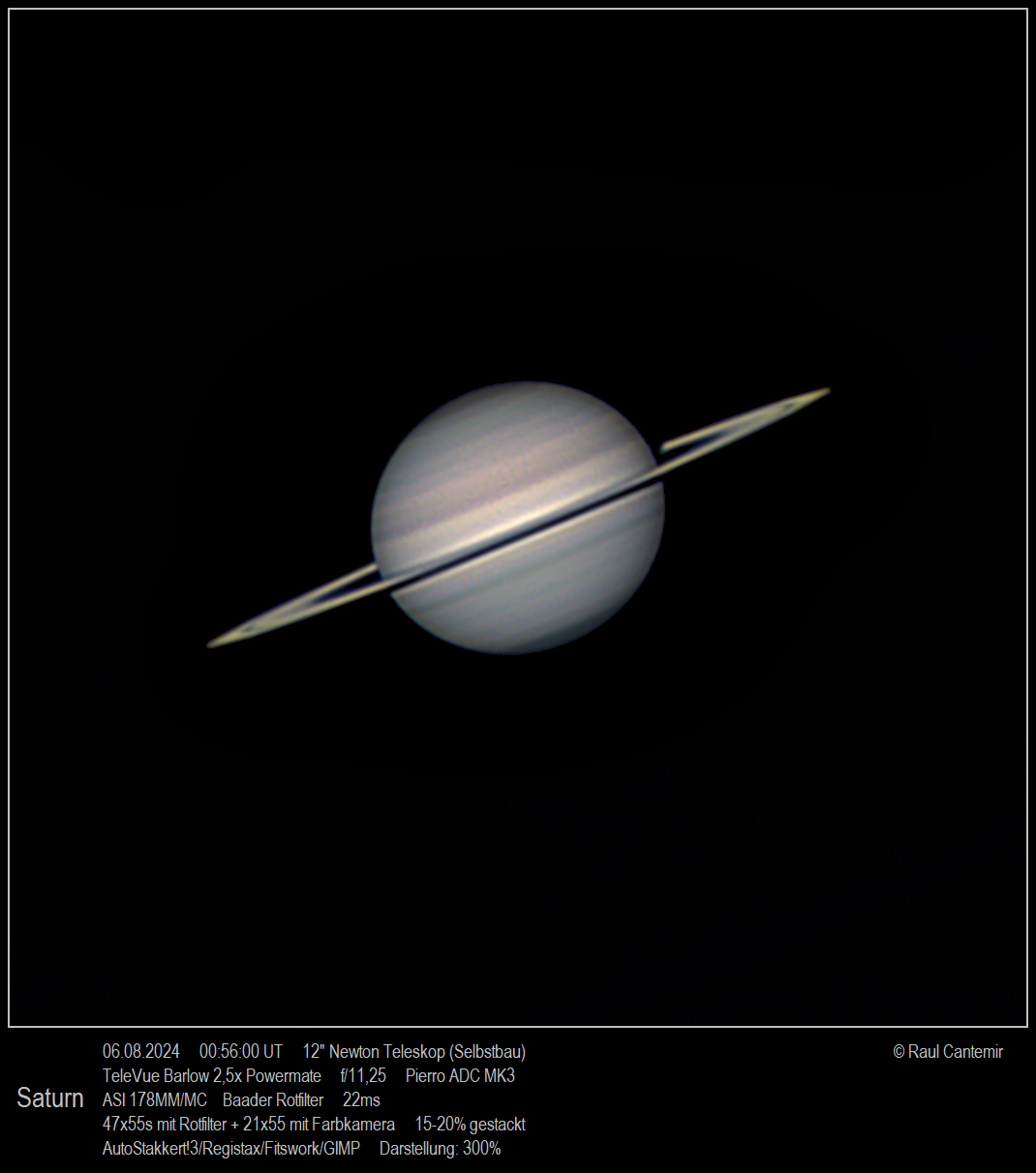 Saturn bietet sich aktuell schon fast an fotografiert zu werden. Aktuell zeigen sich einige sehr feine Strukturen auf der Oberfläche von Saturn. Das Sechseck um den Nordpol des Planeten zeigt sich zurückhaltend. Es wurden verschiedene Filter eingesetzt, um möglichst viel aus den Aufnahmen herauszuholen. Der Rotkanal als Luminanzanteil verstärkt die Bänderkonturen des Planeten.
