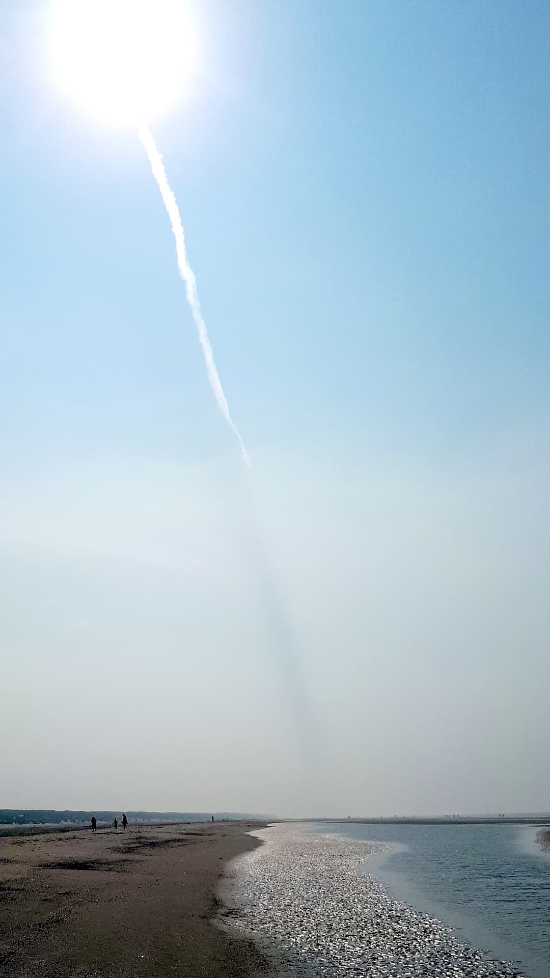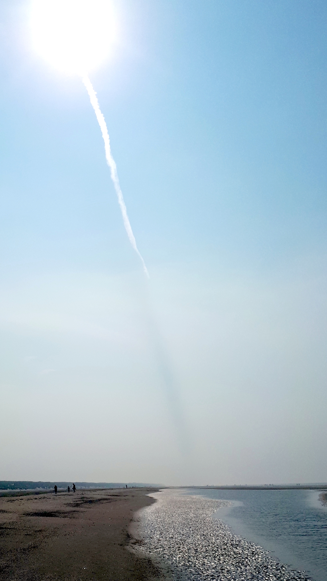 Nur wenige Sekunden war dieser Anblick während eines Spaziergangs am Strand der Nordseeinsel Juist zu sehen. Einige Freunde fragten beim Betrachten des Bildes, ob denn da ein missglückter Raketenstart zu sehen sei. Der Start von Alexander Gerst stand ja kurz bevor. Es war zum Glück jedoch 'nur' der Schatten des Flugzeug-Kondensstreifens. (GGf. kann man noch herausfinden, welches das war.)