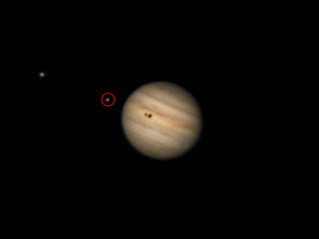 Eine Animation der Verfinsterung von Io durch Ganymed am 5. Juni 2021. Natürlich war das Seeing sehr schlecht. Die Höhe war nur zwischen +9° und +19°. Aber man sieht doch sehr schön die Verfinsterung von Io und ihn dann auch gleich am Rande des Planeten wieder auftauchen. Zur besseren Verfolgung habe ich Io mit einem roten Kreis markiert. Zeitspanne 2:15 - 3:45.