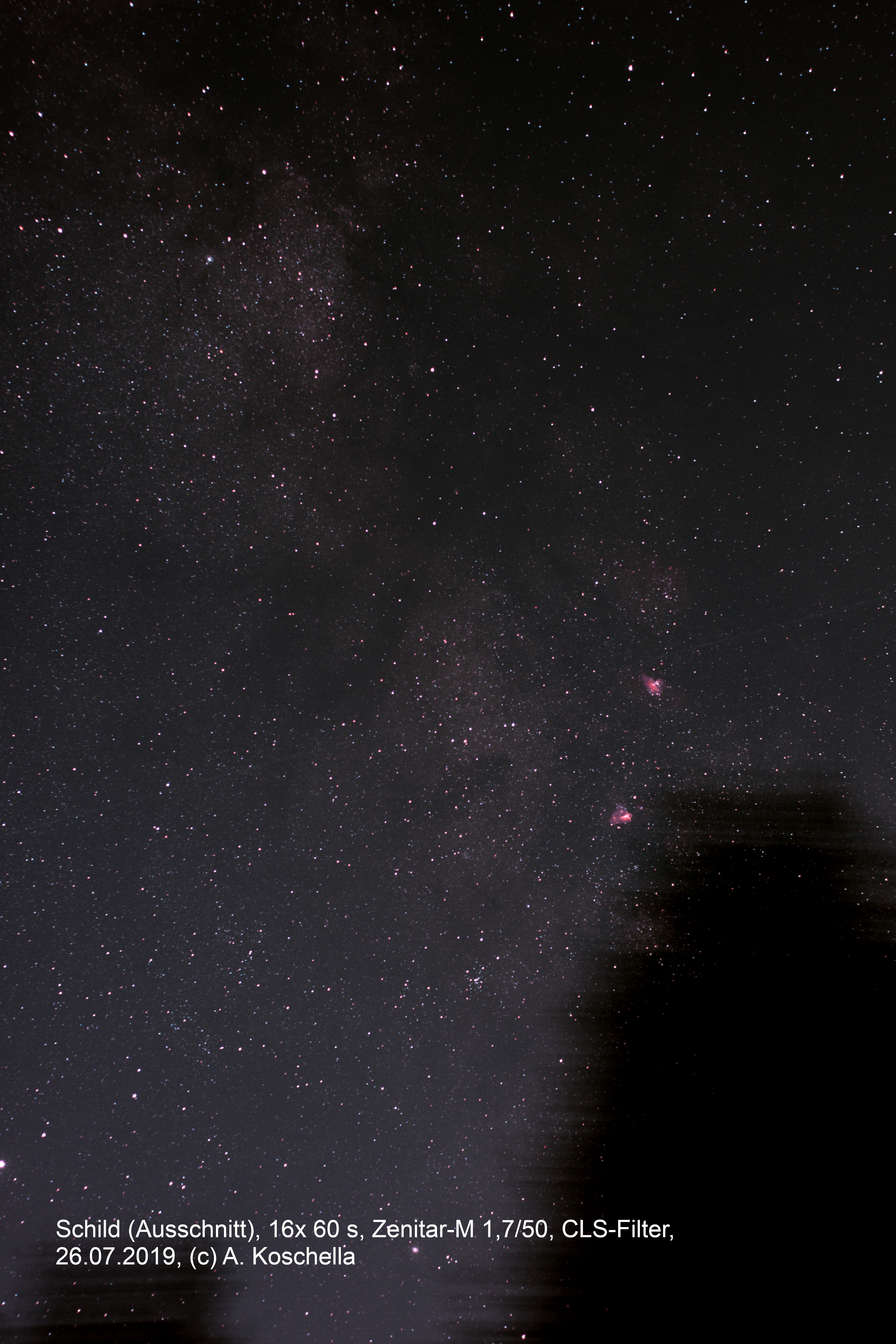 Hier ist mal ein abendliches Urlaubsfoto aus dem Spreewald. Es zeigt die Region um das Sternbild Schild mit etwas "bewegter" Landschaft. Neben dem Baum ist der Omega-Nebel (M 17) und darüber der Adler-Nebel (M 16) zu sehen.