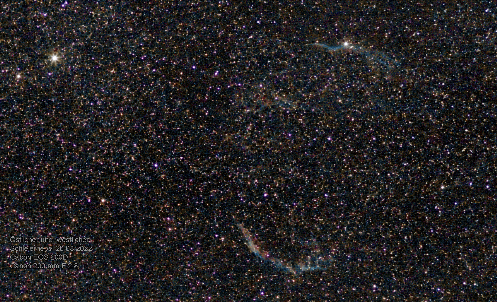 Clear Skys im August, aber leider auch die leidige Lichtverschmutzung in Flughafennähe. Aus meinem Garten in Bremen mit TS CF Apo 70 x 420 und Canon 200D auf Skywatcher AZ GTI goto EQ. Als Ziel der östliche und westliche Schleiernebel.