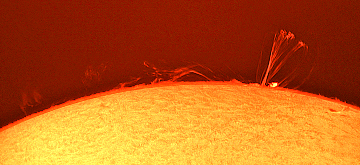 Wie zugesagt habe ich das Bild mit dem kleinen Energieausbruch bei der Schleifenprotuberanz bearbeitet und kann es nun zeigen. Genau zu dem Zeitpunkt zogen ein paar Schleierwolken durch, was den Kontrast des Bildes etwas getrübt hat. Aber der Energieausbruch ist sehr deutlich zu sehen. Nach kurzer Zeit, war es wieder vorbei...