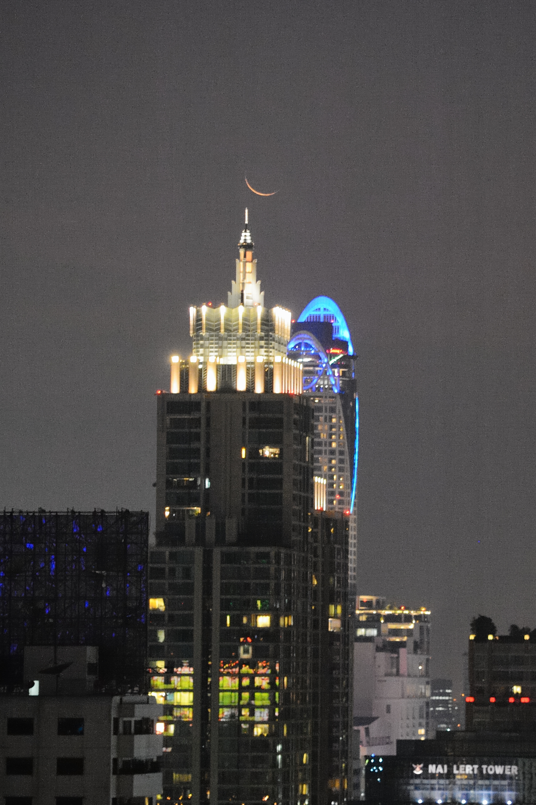 Am Abend des 23.2.2012 entdeckte ich kurz nach Sonnenuntergang knapp über Bangkoks Hochhäusern im Dunst die schmale Mondsichel.