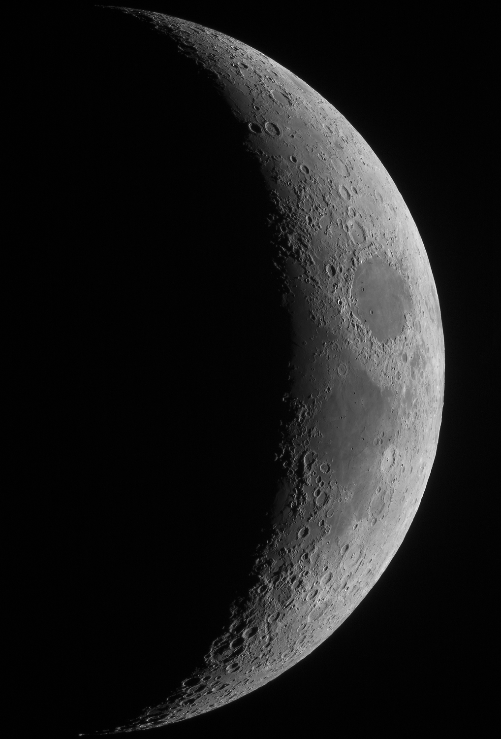 Eines meiner Lieblingsinstrumente für fokale Mondfotografie ist der Coudé-Refraktor der Sternwarte Radebeul. 47 Jahre nach der Errichtung tut selbiger immer noch zuverlässig seinen Dienst … Das Bild zeigt die Mondsichel 99 Stunden nach Neumond.