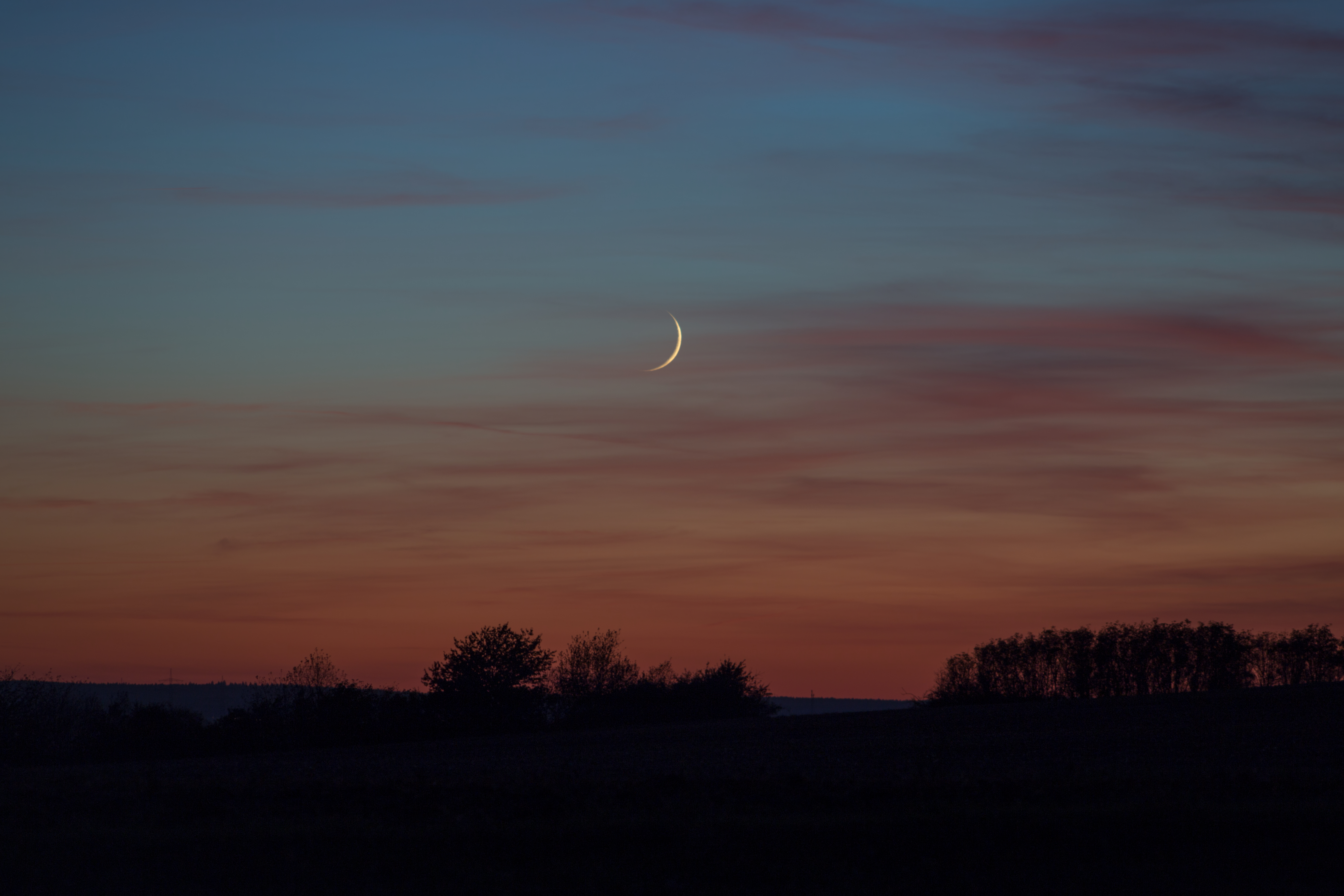 Einen wunderschönen Anblick bot die schmale Mondsichel am Abend des 11. September 2018 vom Lerchenberg bei Börnchen (Nähe Dresden), 48 h nach Neumond. Ein kräftiges Abendrot an dekorativen Zirruswolken verschönerte die Szenerie. Auch ohne Planeten wirkt die Sichel sehr reizvoll …