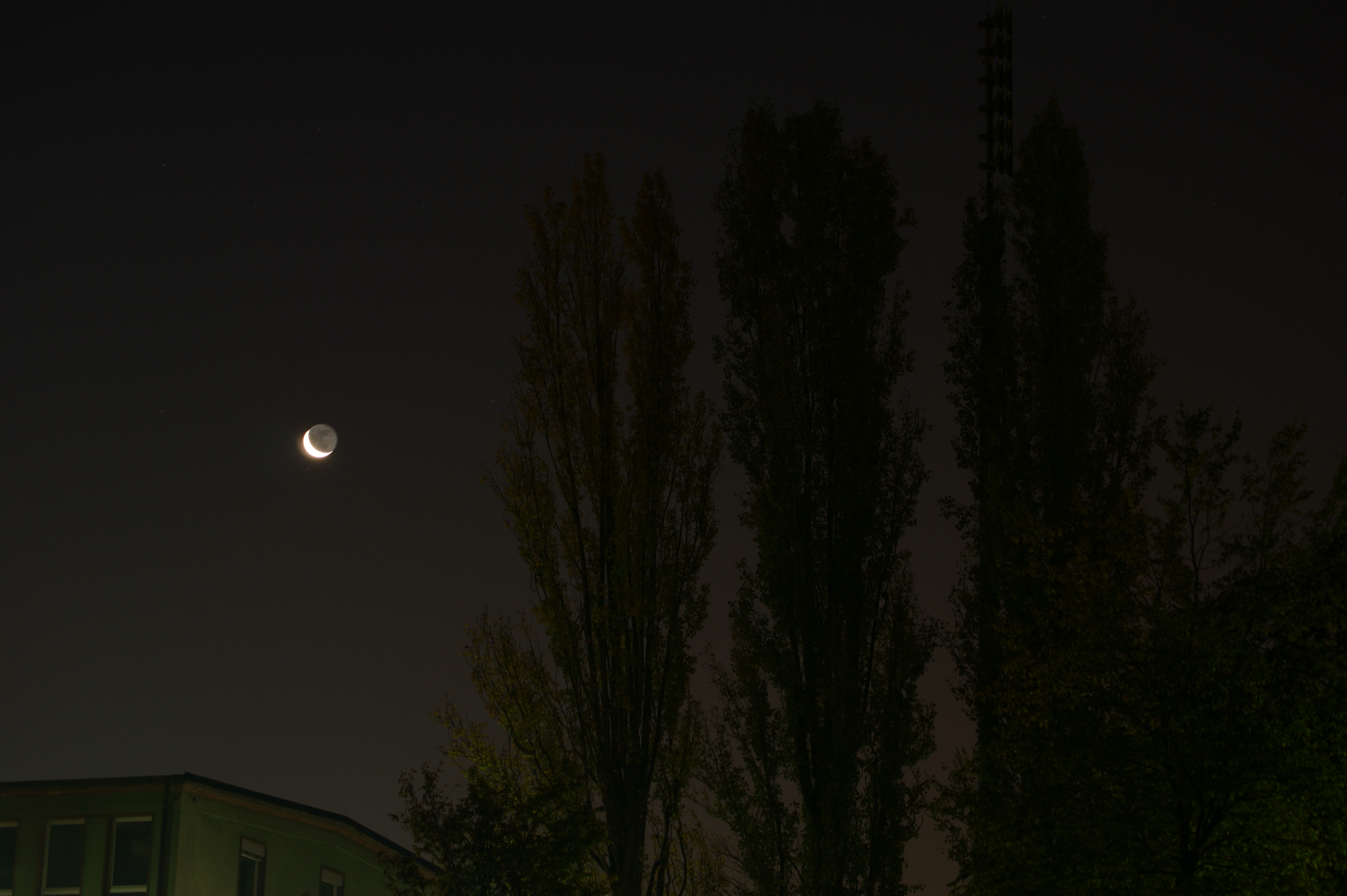 Am 23.10.2011 um 6:12 Uhr MESZ machte ich ein paar Bilder von der schmalen Mondsischel. Man hat sogar die dunkele Seite gesehen. Es war ein sehr klarer Himmel als der Mond am Horizont stand.