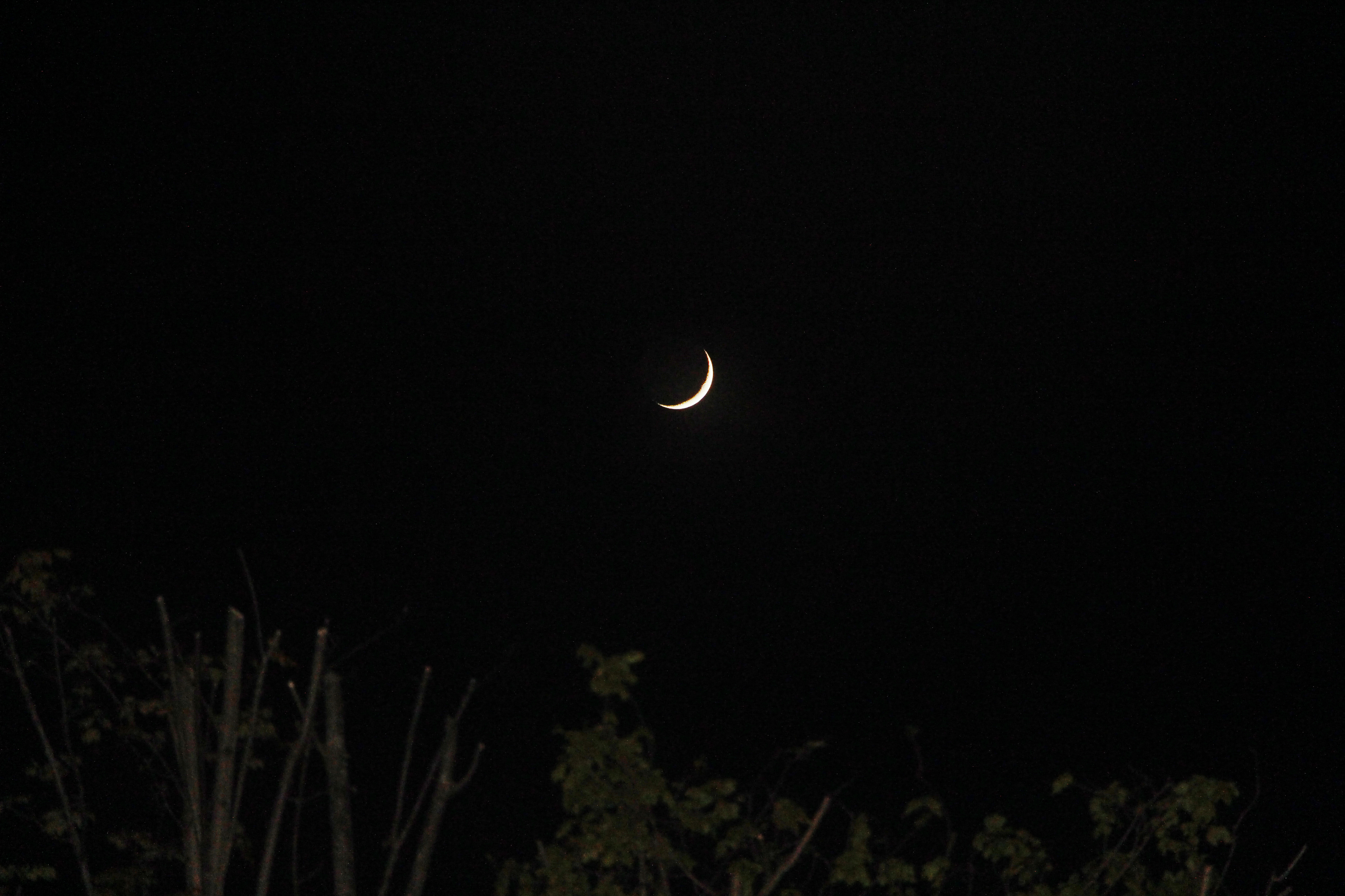 Ein Schnappschuss der jungen Mondsichel über den Bäumen.