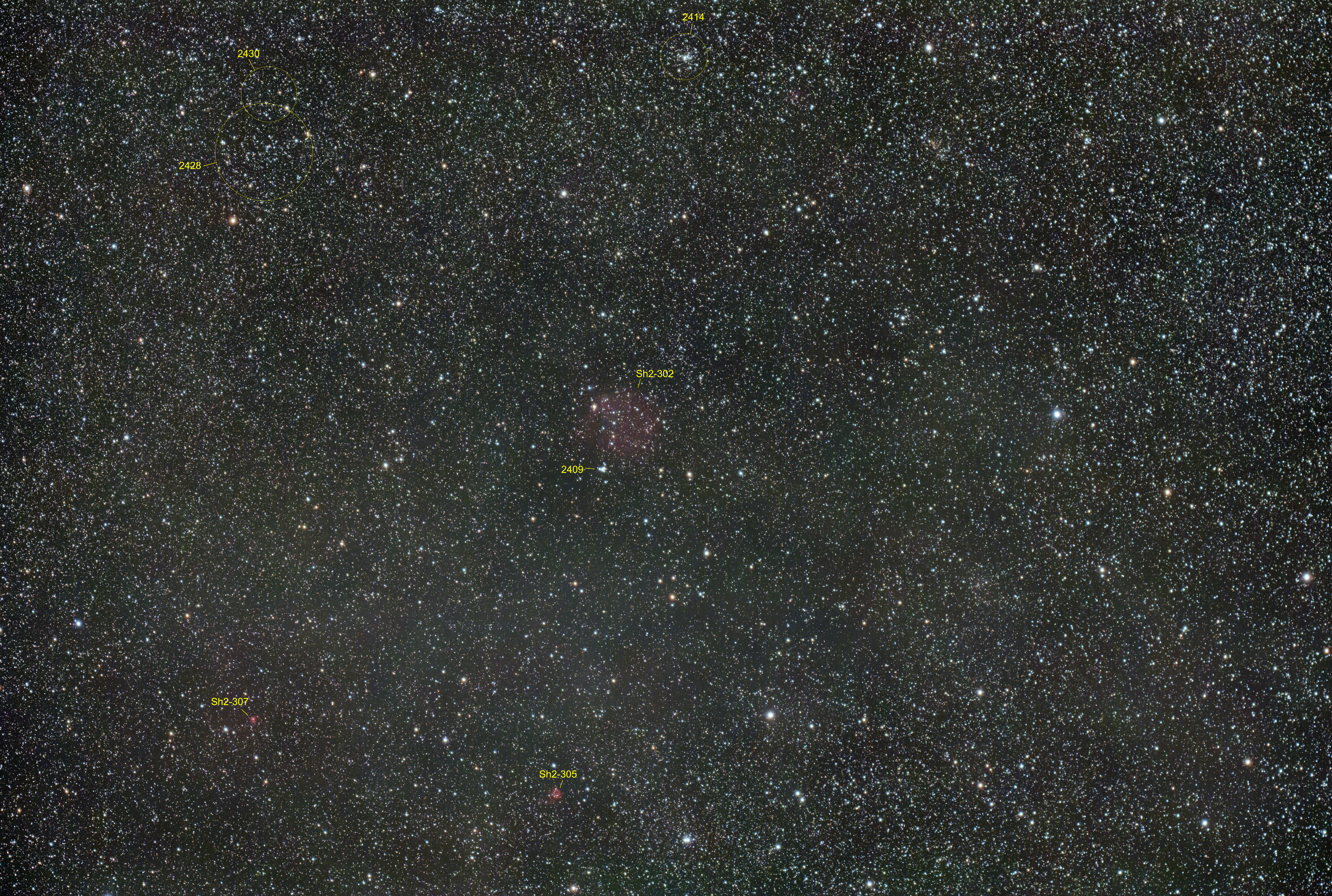 Wohl eine der letzten Gelegenheiten in dieser Jahreszeit den Schneemann-Nebel Sh2-302 noch zu erwischen. Leider war keine längere Belichtung mehr möglich. Die beiden Nebel Sh2-305 und Sh2-307 südlich von Sh2-302 sind etwas leuchtkräftiger.