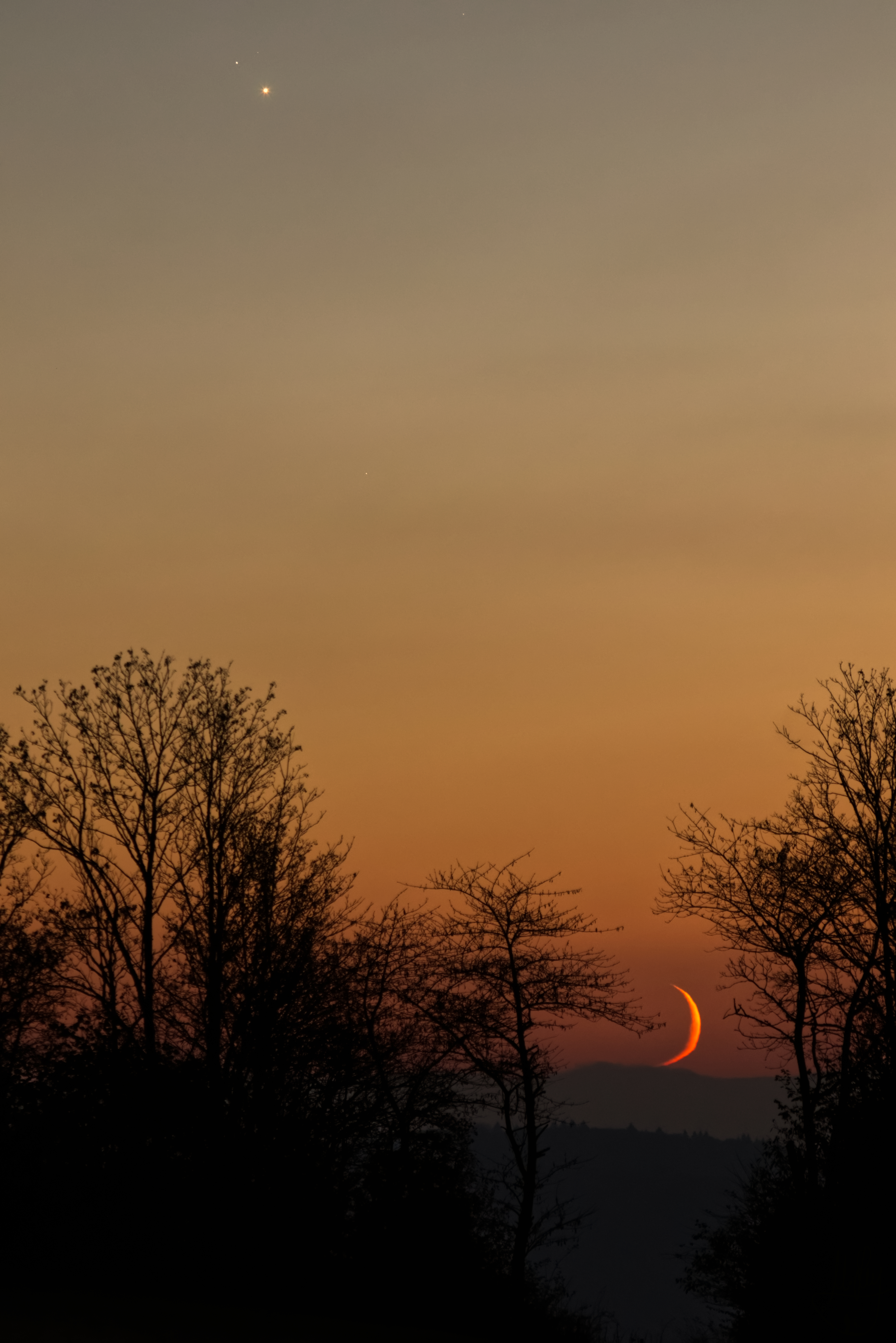 Glasklar war der Abend des 4. November über dem Saartal. Gut für Naturliebhaber. Denn es lohnte sich in der Abenddämmerung der Blick an den Südwesthimmel. Venus ist wieder auffälliger Abendstern und begegnete in der Dämmerung dabei der jungen Mondsichel, kurz vor ihrem Untergang. Gegen 17 Uhr waren sich beide Himmelsschauspieler bis auf einen Winkelabstand von 5,5 Grad nahegekommen. Oberhalb von Venus gesellt sich mit dem Stern Theta Ophiuchi ein weiteres Gestirn auf die Himmelsbühne.