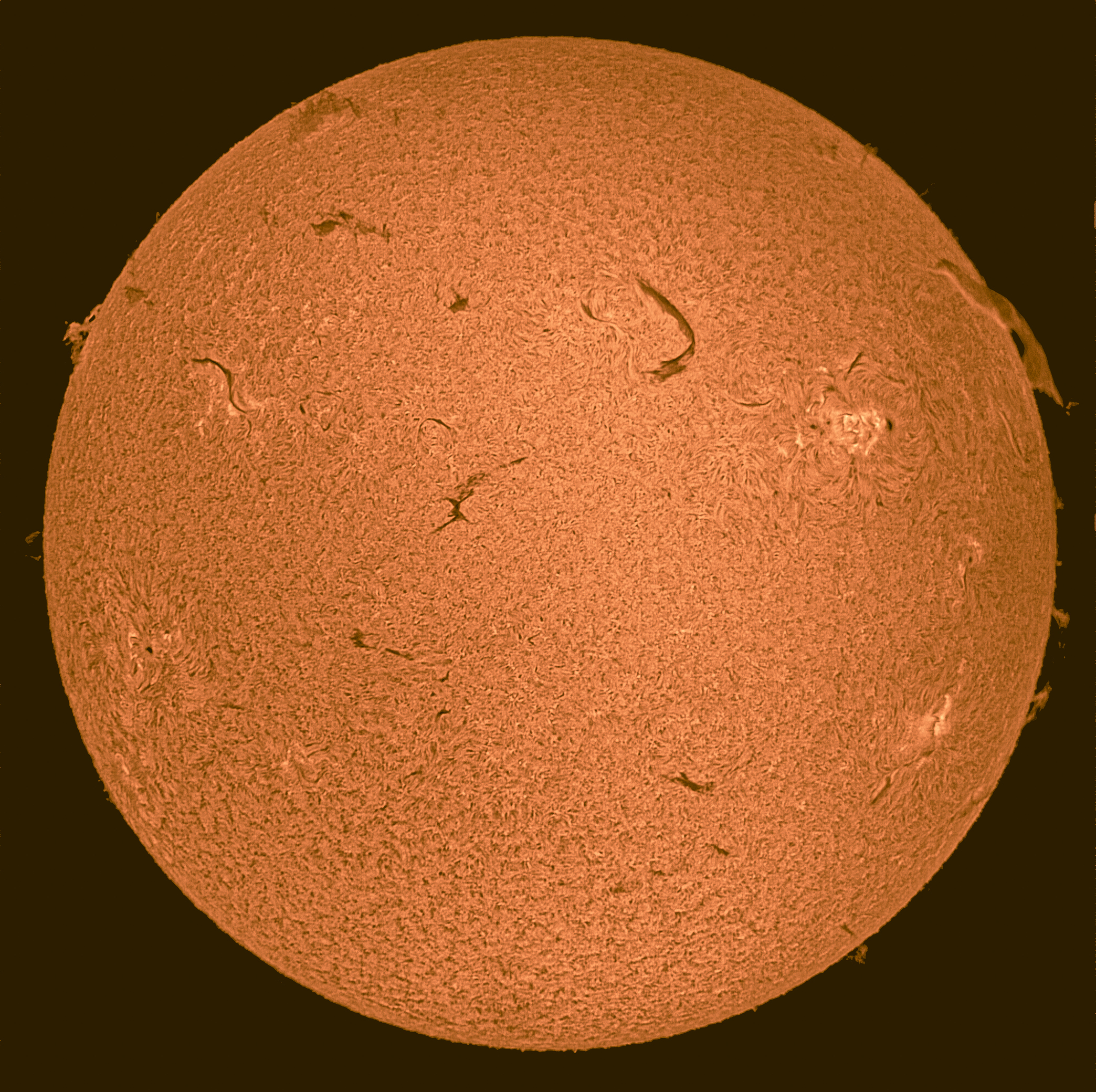 Das Filament auf den letzten H-Alpha-Aufnahmen in diesen Tagen erscheint jetzt durch die Rotation der Sonne am Rand (oben rechts).