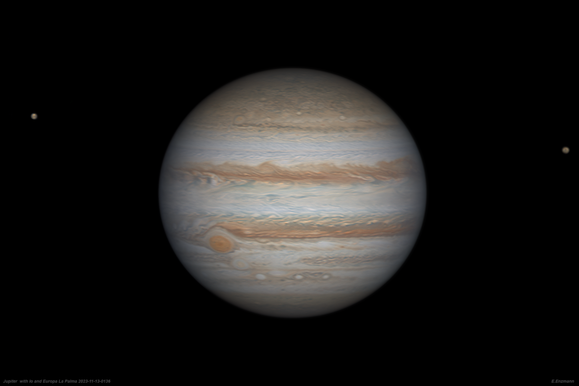 Am 13. November 2023 gab es gegen 01:36 UT eine schöne Jupiter-Konstellation. Er zeigte seinen Großen Roten Fleck und dazu gesellten sich zwei Monde. Links ist Europa zu sehen, rechts Io. Glücklicherweise herrschten gerade zu dieser Zeit gute Bedingungen, die es mir erlaubten, diese Aufnahme zu machen.