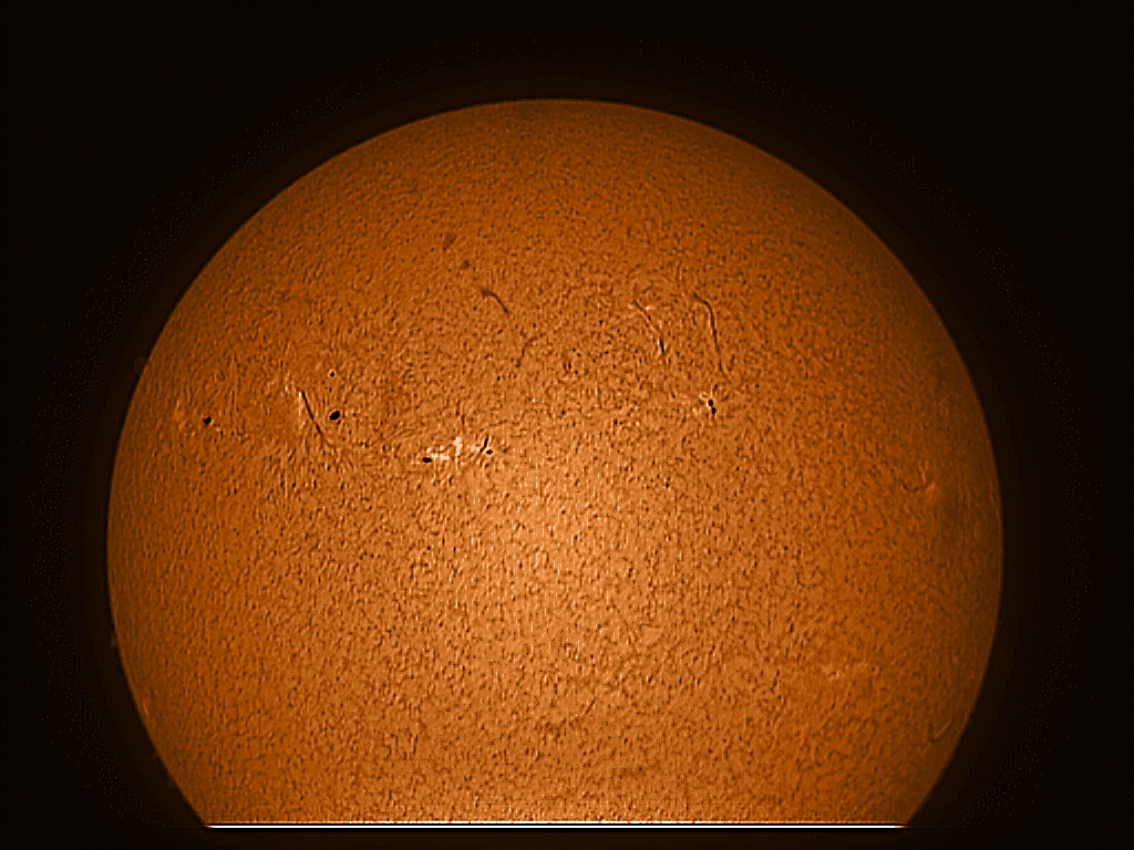 Da die Details auf der Sonne schön zu erkennen waren, habe ich eine Videosequenz von ca. 350 Bilder zu einem Summenbild verarbeitet und dann mit den unten genannten Programmen bearbeitet.