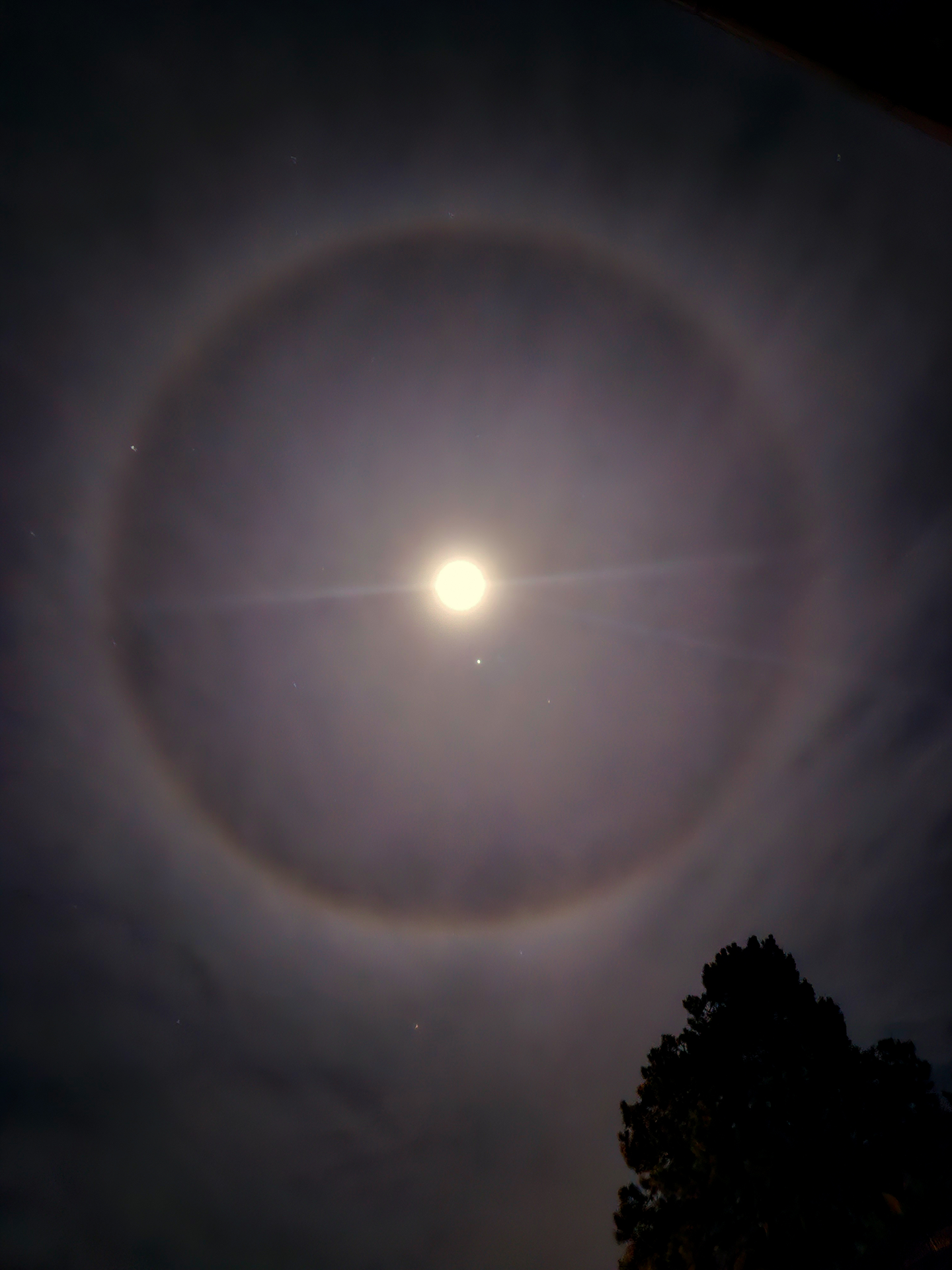 Markus Orterer hat am 10. Januar 2025 südlich von München eine wunderschöne Aufnahme von einem Mondhalo gemacht. Unterhalb vom Mond gesellt sich Jupiter dazu.