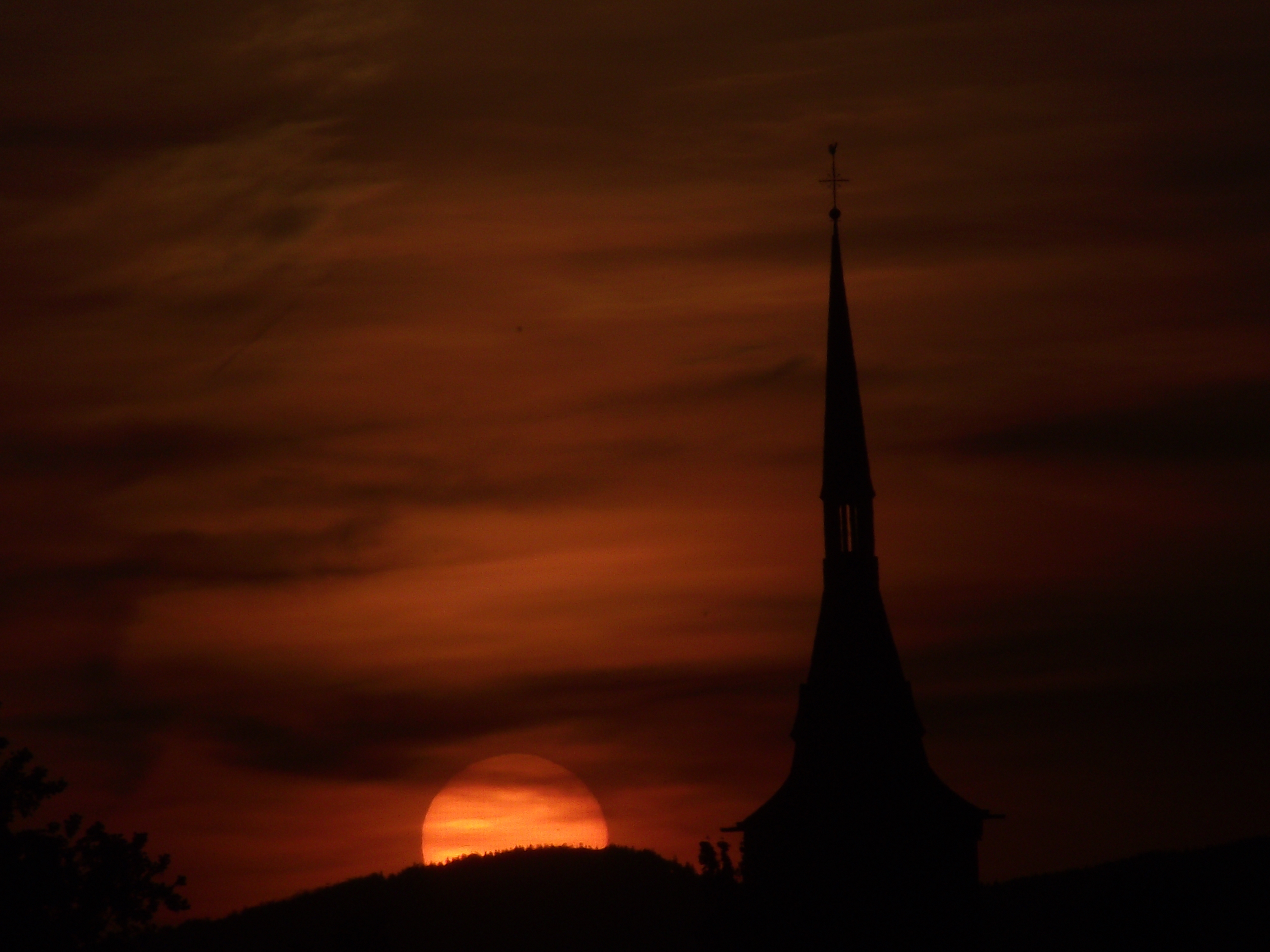 Der Sonnenuntergang gestern, 7. Mai 2011, mit einer Kirche neben der Sonne. Die Sonne geht vor Bergen unter. Das Sonnenlicht ist orange und nicht rot wie beim Letzen Bild.