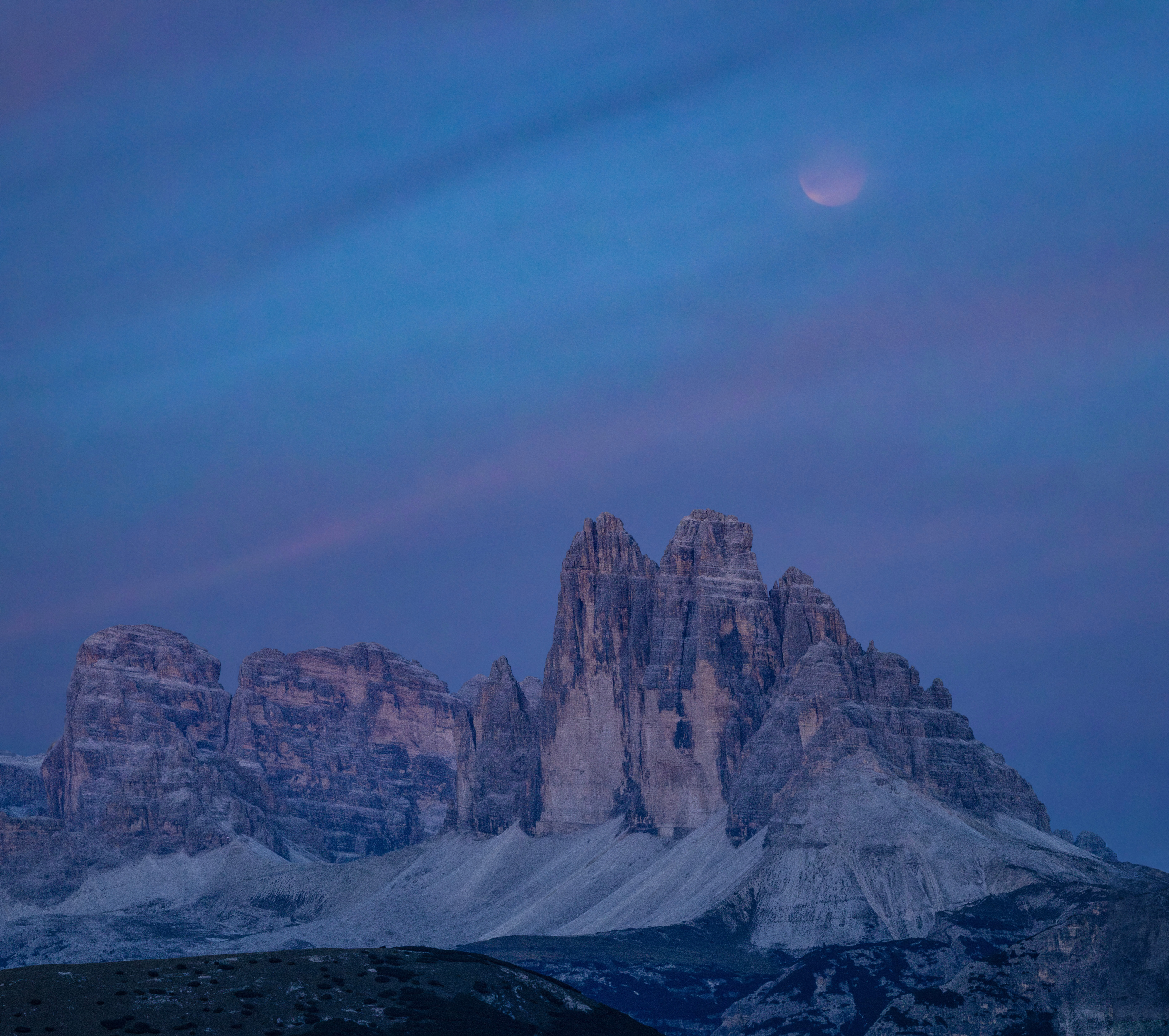 Es hätte mein Astrofoto des Jahres werden sollen: Der total verfinsterte Mond geht über den weltberühmten Drei Zinnen auf. Entsprechend gewissenhaft war meine Vorbereitung. Leider hat man nicht alle Faktoren selbst in der Hand. Dichte Schleierwolken haben das Ereignis zwar weitgehend verdeckt, aber das Naturerlebnis konnten sie dennoch nicht schmälern.