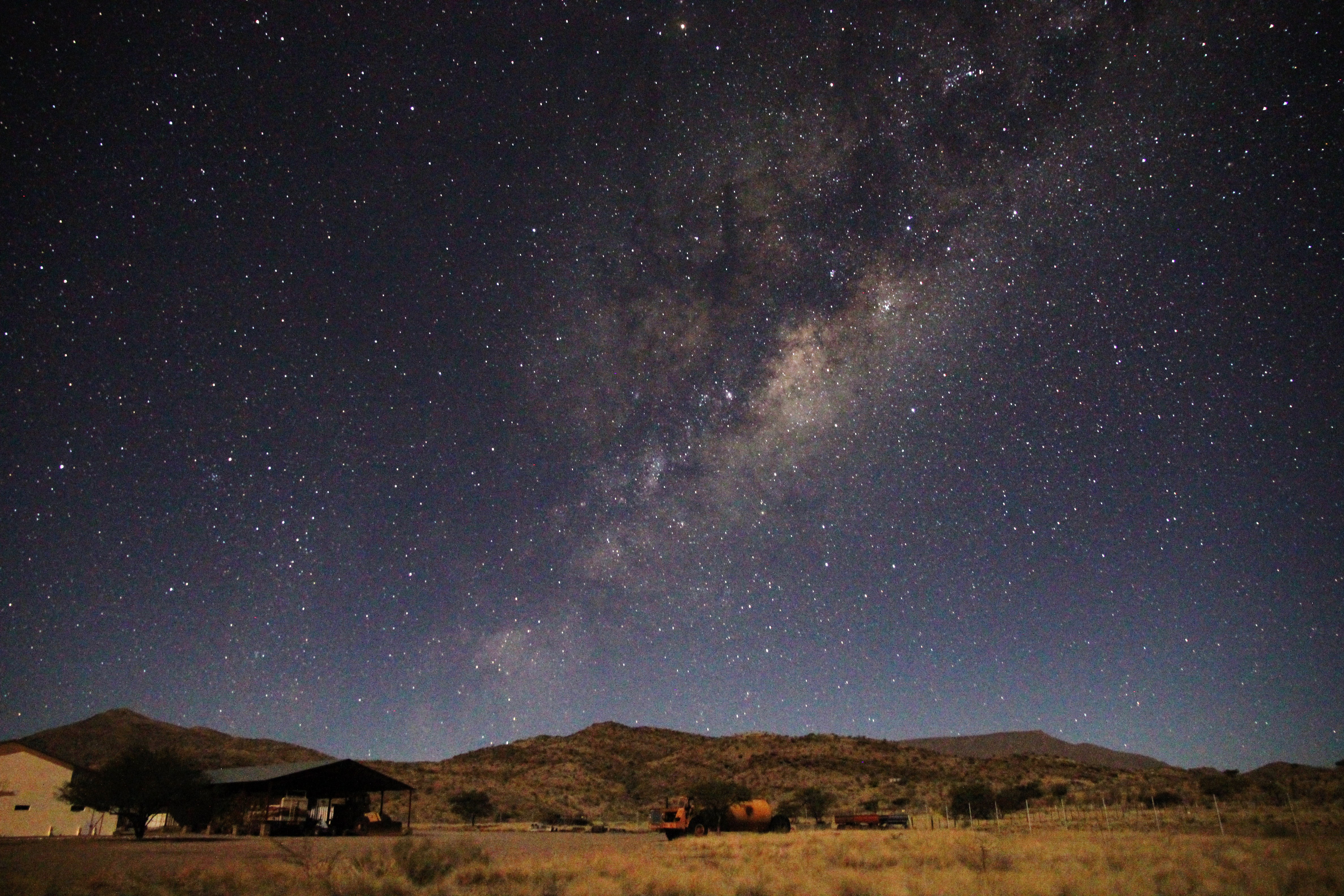 Wie vorhin bei Mondlicht, diesmal in Richtung Osten, Schütze ist bereits über dem Gamsberg aufgegangen und Scutum ist auch schon über der Bergkante.