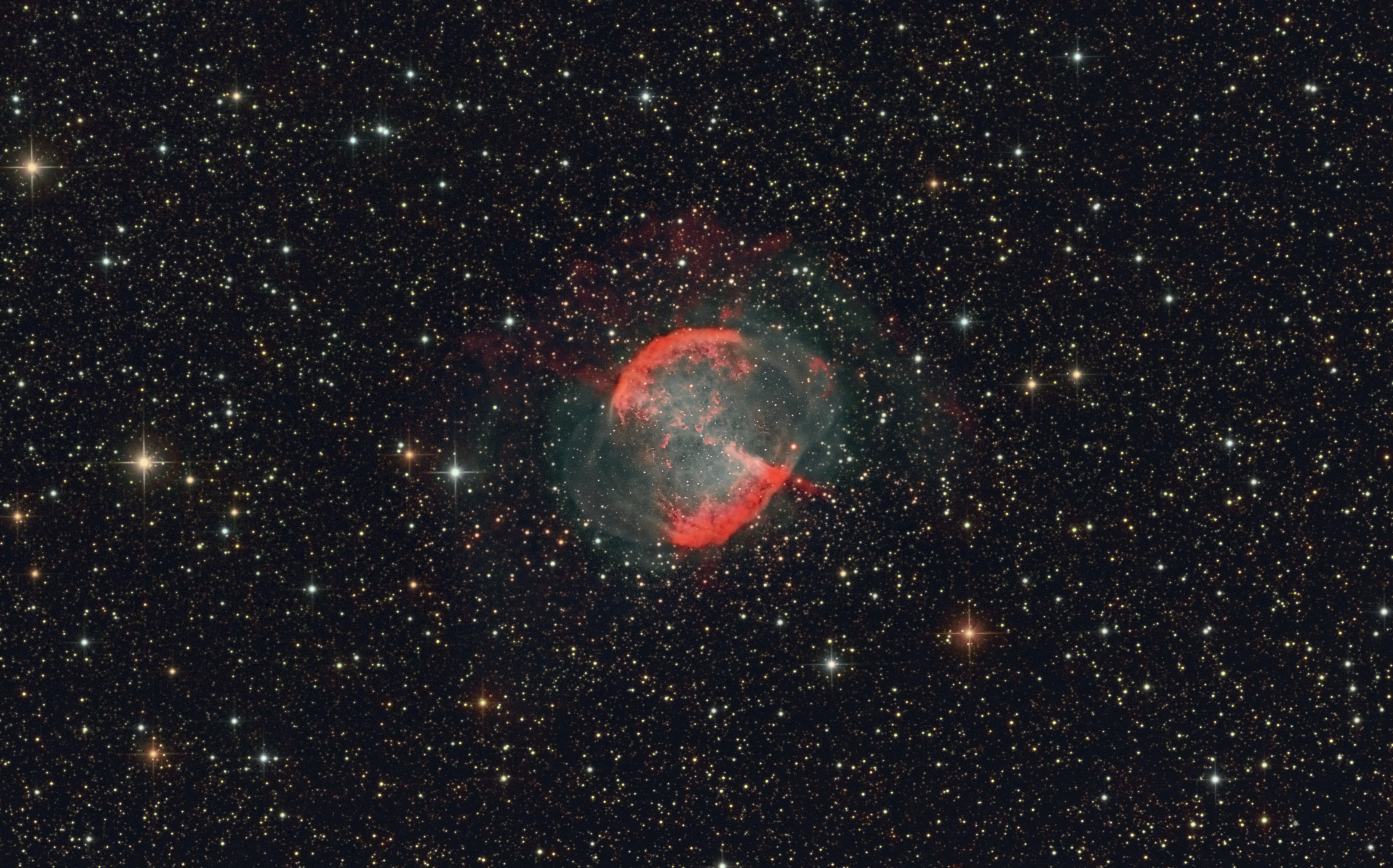 Dieses Mal will ich euch nicht nur M27 präsentieren, sondern auch einen schwachen Halo um den Hantelnebel herum. Um diesen Halo sichtbar zu machen, brauchte ich fast 8 Stunden Belichtungszeit meiner Spiegelreflexkamera Eos 1000da. Zusätzlich wurde ein 2" IDAS LPS2 Filter eingesetzt.