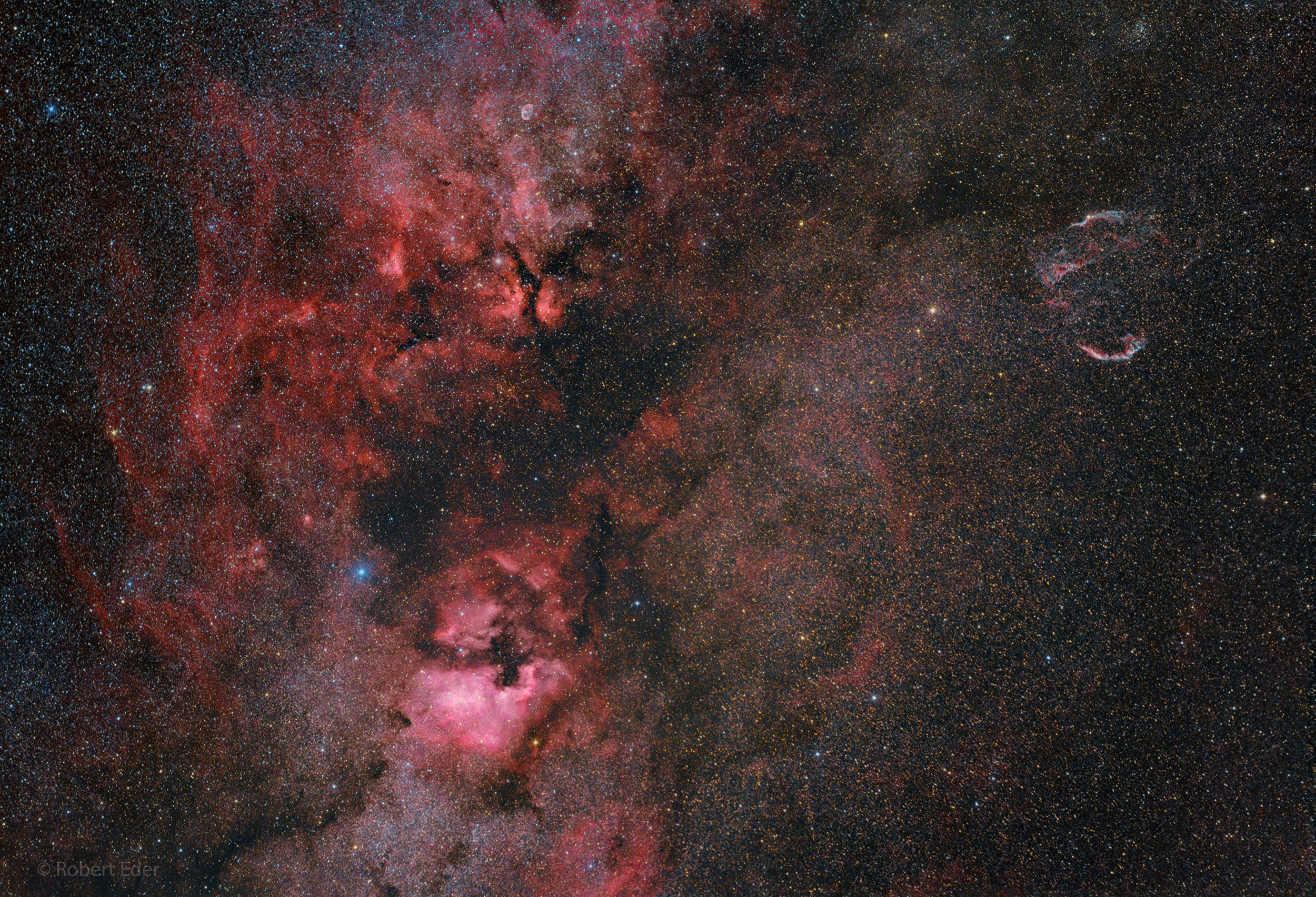 Das gewaltige H-Alpha-Gebiet im Sternbild Schwan. Eigentlich wollte ich den ganzen Schwan mit dem 24-mm-Objektiv aufnehmen, aber mir hat dann das 50 mm mit mehr Details doch besser gefallen, auch wenn jetzt nur ein Ausschnitt drauf ist.
