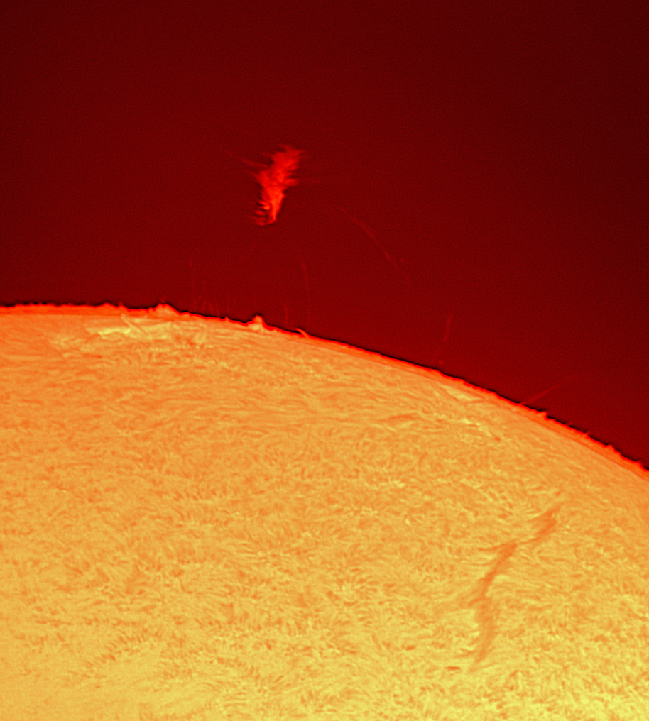 Einen nicht so oft vorkommenden Anblick bot diese Protuberanz. »Völlig losgelöst von der - diesmal nicht Erde, sondern - Sonne«. Schön zu erkennen sind die feinen Ausläufer und das Filament rechts gibt das Tüpfelchen auf dem i. Das Bild habe ich gedreht, wegen des »besseren« Anschauens.