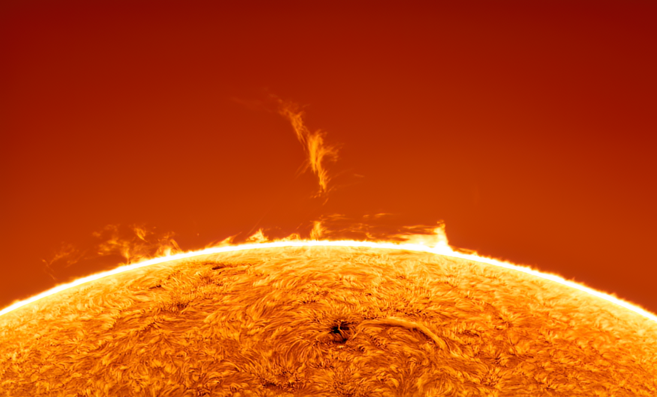 Am Nachmittag des 16. Juli 23 war unter schwierigen Bedingungen eine große, schwebende Protuberanz auf der Sonne zu sehen. Diese erreichte (gemessen im Bild) eine Höhe von rund 130000 km.