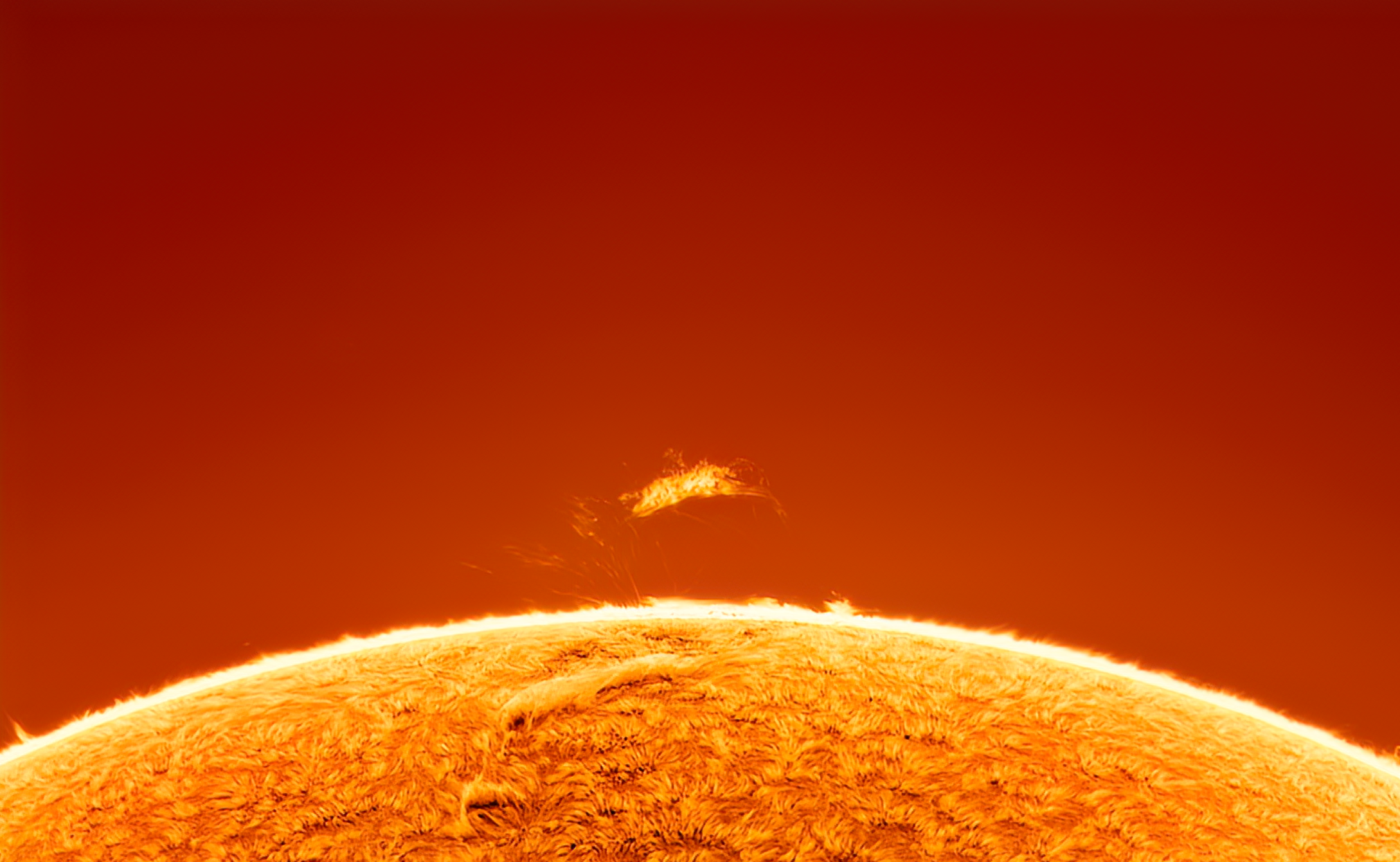Mit ein bisschen Fantasie denkt man bei dem Bild an ein feuriges Pferd, das über eine rote Glut springt. In Wirklichkeit handelt es sich dabei natürlich nur um riesige Mengen an Wasserstoffplasma, das den Magnetfeldern der Sonne folgt. Bei genauem Hinblick sieht man sogar die feinen Plasmafäden, die vom "Pferd" aus zur Oberfläche der Sonne führen.