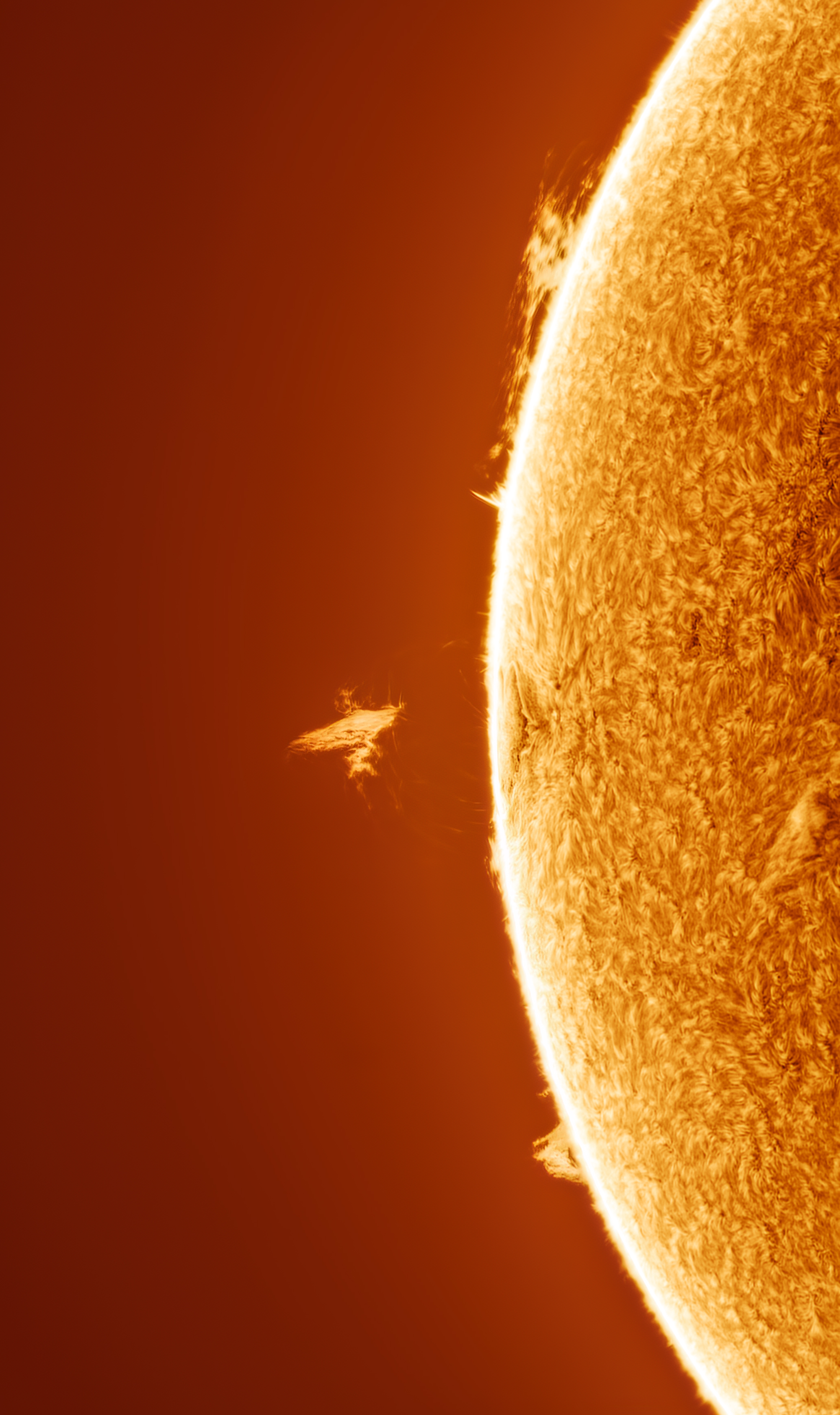 Am Abend des 10. August 2025 zeigte sich eine filigrane, schwebende Protuberanz am östlichen Sonnenrand. In der He-II-Linie ist deutlich zu erkennen, dass Plasmafänden diese mit der Sonne verbinden. Im H-alpha hingegen sind diese nur sehr schwach auszumachen und es war eine Herausforderung in der Bildbearbeitung diese »herauszukitzeln«.