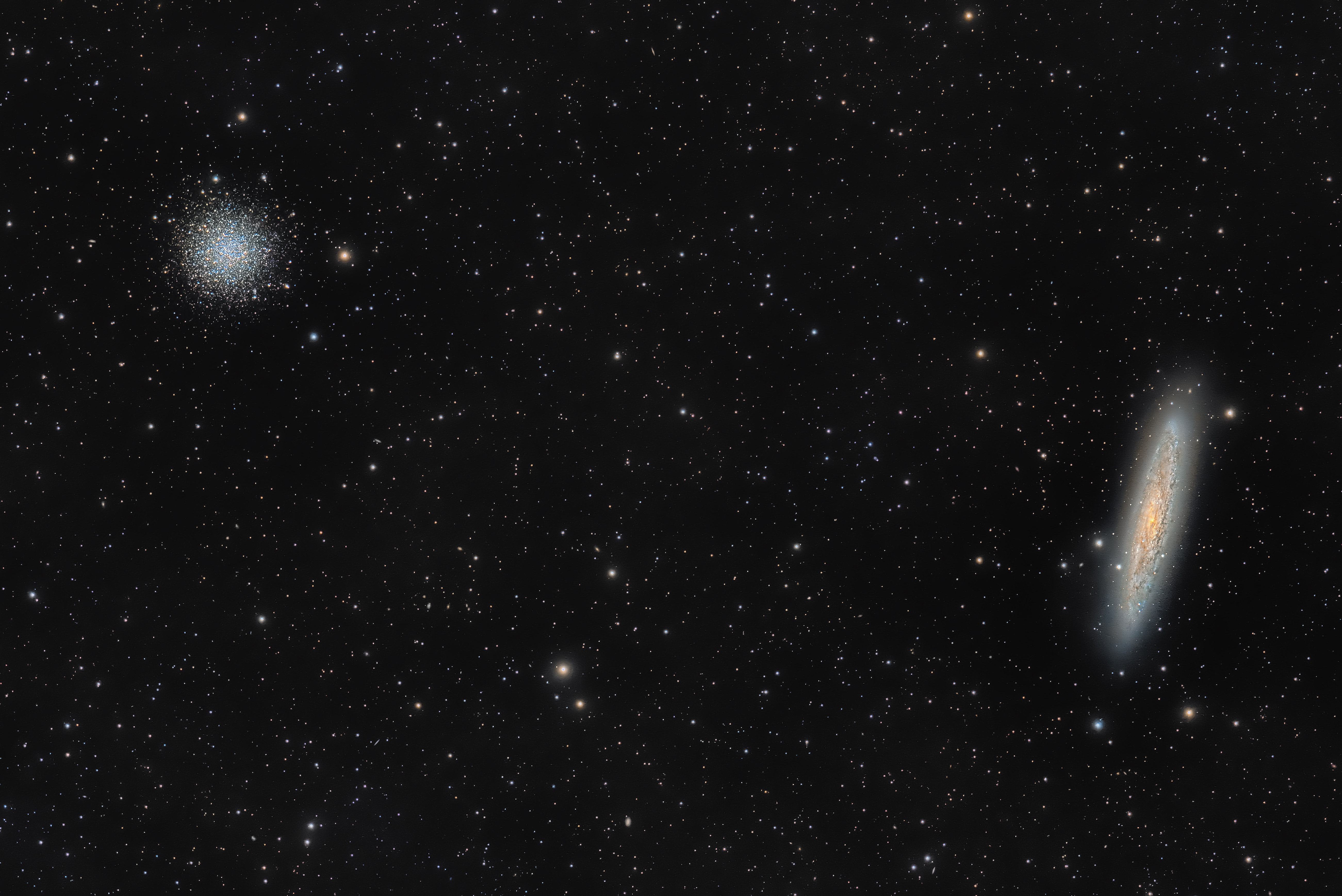 Der Kugelsternhaufen NGC 288 Bildet mit der Galaxie ein ungleiches aber auch sehr schönes Paar. Er ist im Vergleich zu der Galaxie "lediglich" 30000 Lichtjahre von uns entfernt (Zeitkontext: etwa als der Neanderthaler ausstarb)