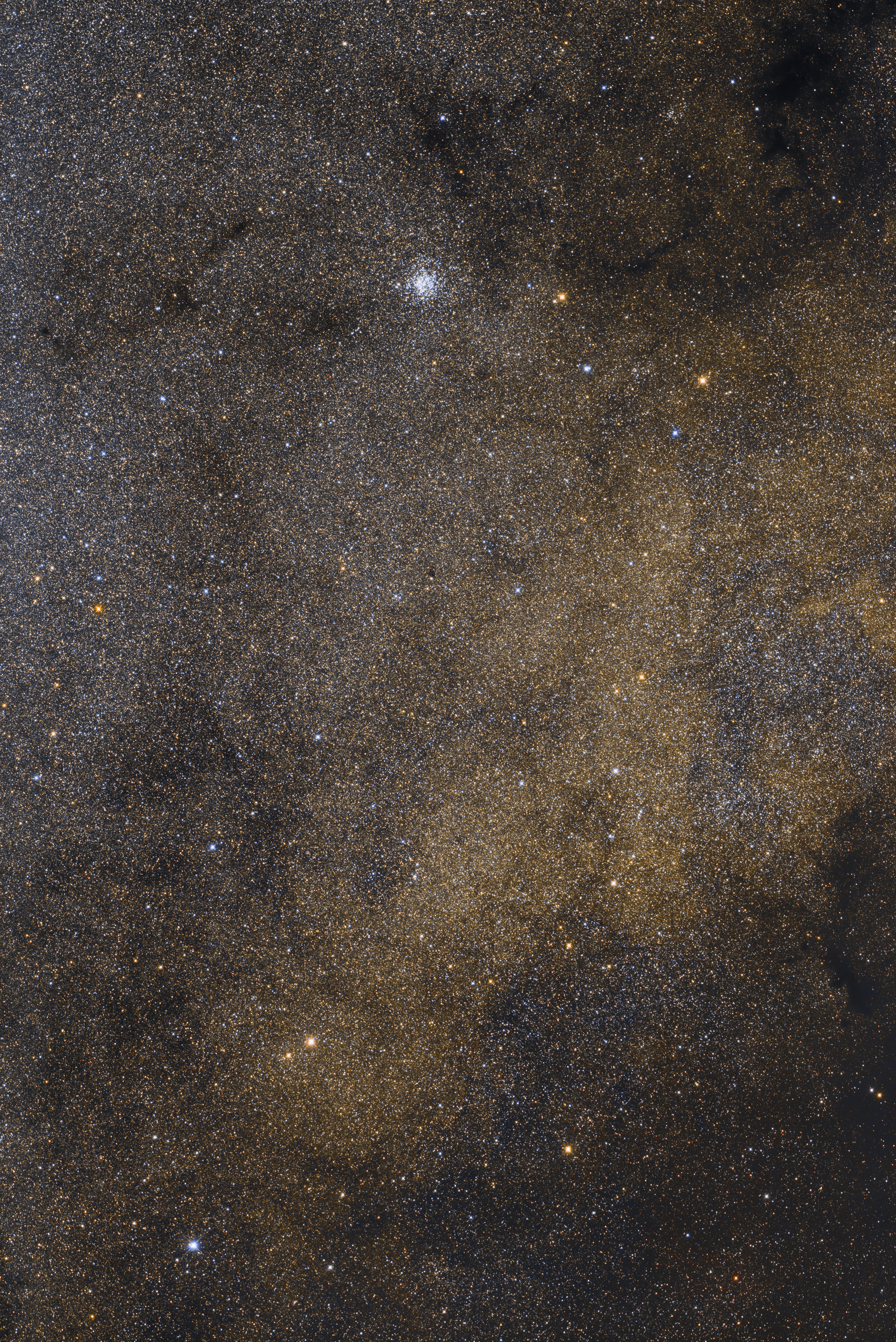 Ein Sommernachtstraum … die Schildwolke ist eines der sternreichsten Gebiete der Sommermilchstraße, und der offene Haufen Messier 11 thront obenauf zwischen Dunkelwolken. Der Verlauf der Sternfarben ist interessant, rötlich bei den Sternen der Wolke und bläulich gegen den Adler zu. Hier sehen wir die Extinktion an der Arbeit, die Wolkensterne liegen in rund 6000 Lichtjahren Enfernung.