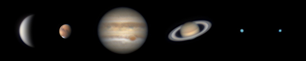 In der Nacht vom 23. Juli zum 24. Juli 2020 gelang es mir nacheinander Bilder von den sechs Planeten Venus, Mars, Jupiter, Saturn, Uranus und Neptun aufzunehmen. Leider ist es von meinem heimischen Balkon wegen Bäumen und Häusern kaum möglich auch noch den Planet Merkur mit zu fotografieren. Das Seeing war eher mittelmäßig, jedenfalls eindeutig schlechter als am 2. Juni 2020, dennoch sind eine ganze Reihe an Details erkennbar. Es lassen sich die Größenverhältnisse der Planeten vergleichen, die Phasengestalt von Venus ist sichtbar, Mars zeigt einige Strukturen und die südliche Polkappe, bei Jupiter ist der Große Rote Fleck sichtbar, bei Saturn kann die Cassini-Teilung erkannt werden und bei Uranus und Neptun ist zumindest der bläuliche Farbton sichtbar. Dies ist auch ein Beispiel was mit einem kleinen 6 Zoll-Teleskop auch bei teilweise niedrigem Planetenstand alles problemlos geht.